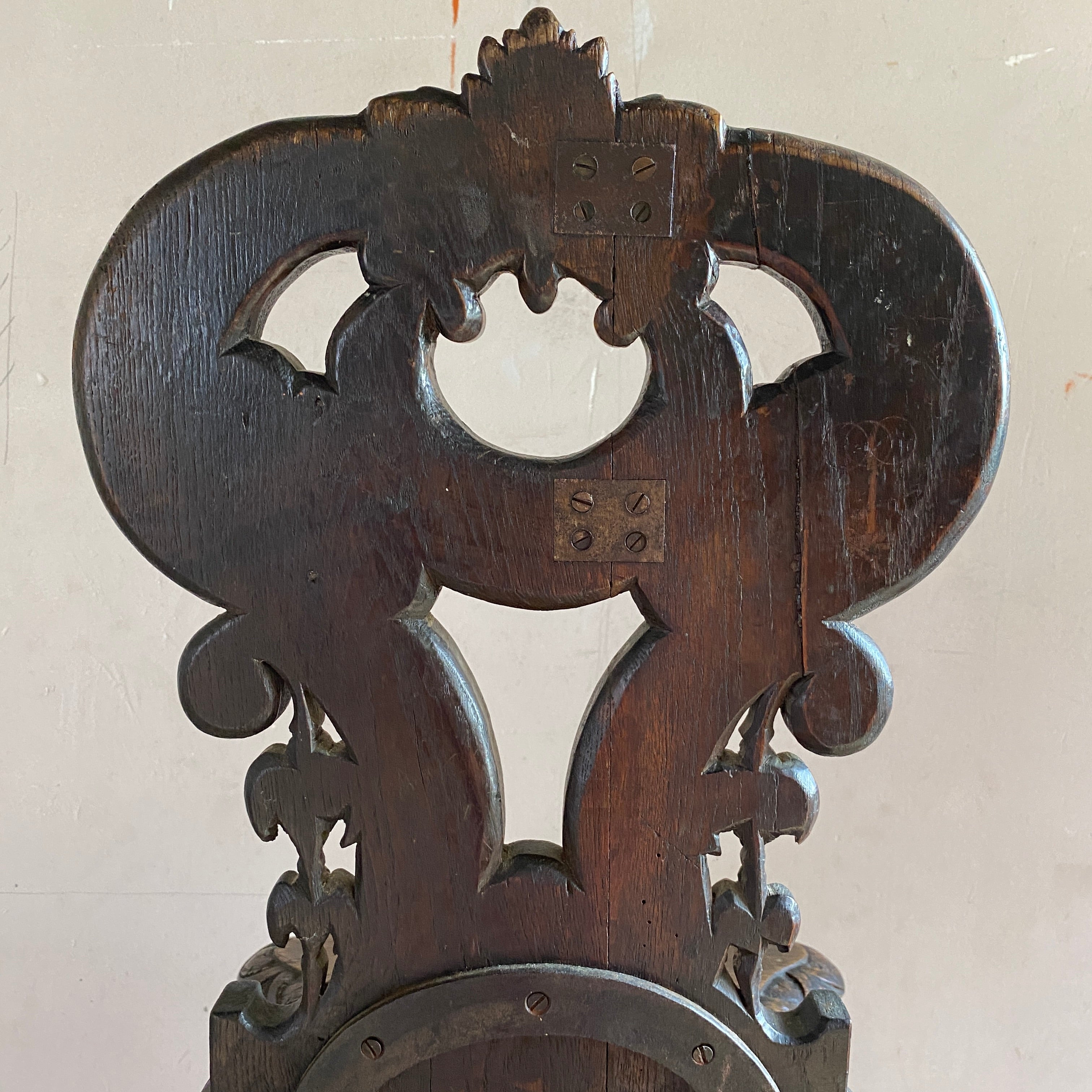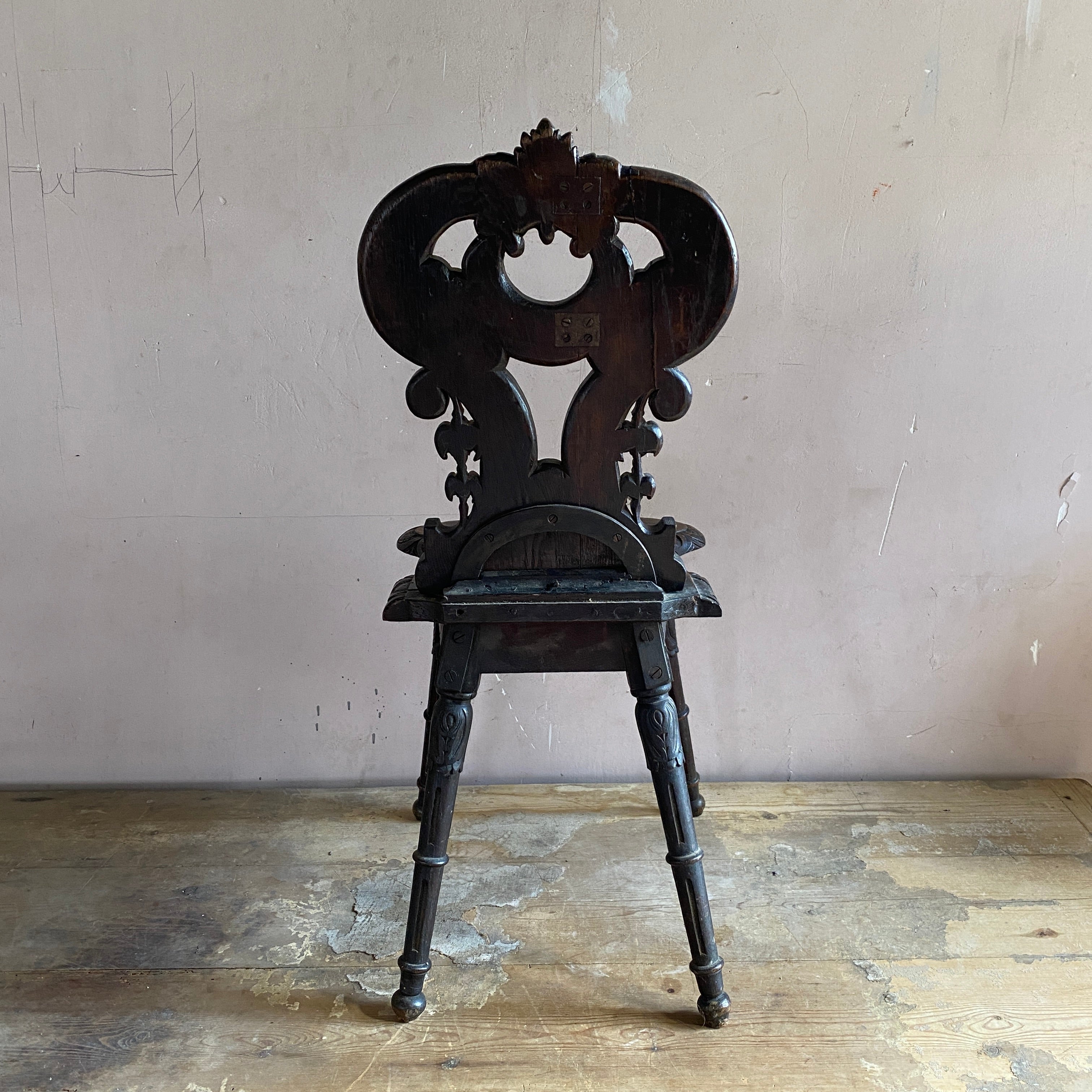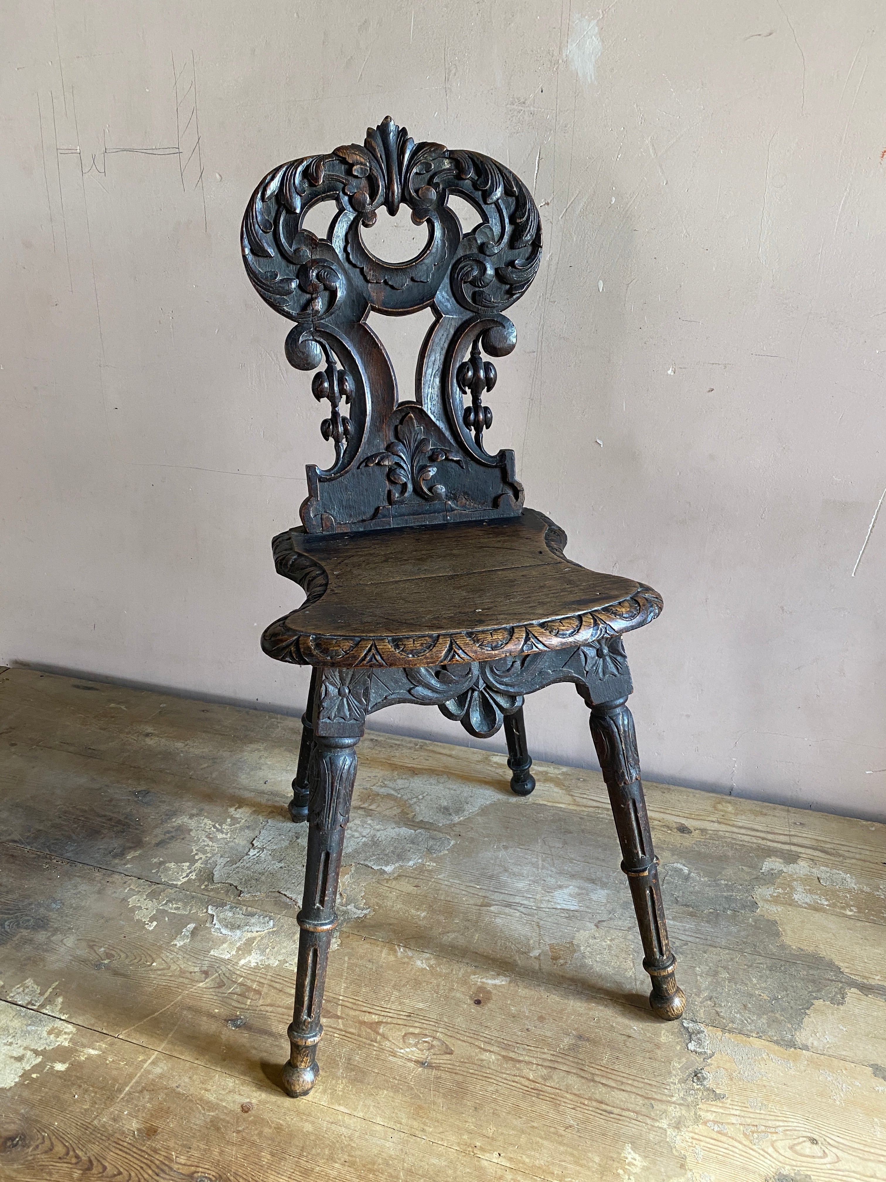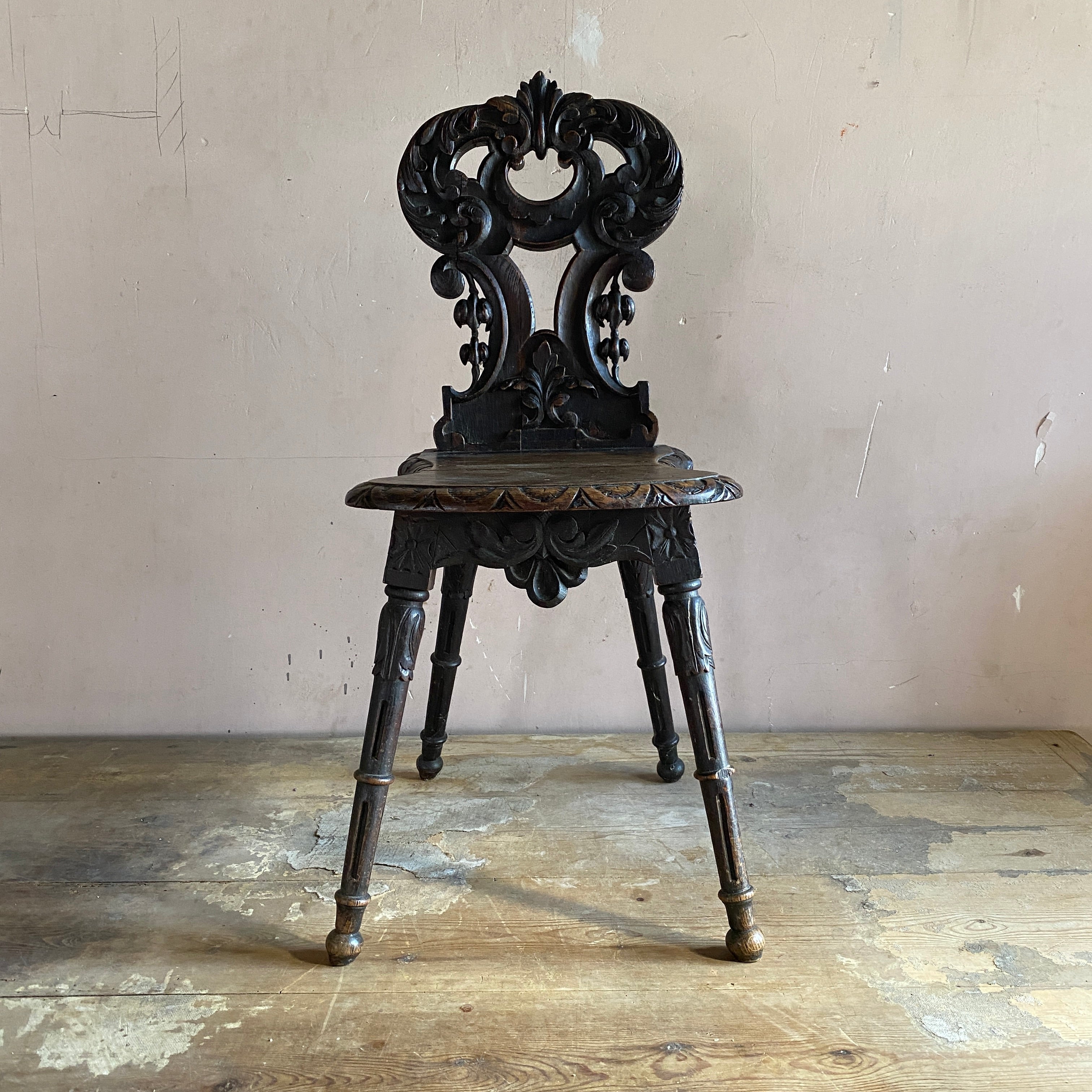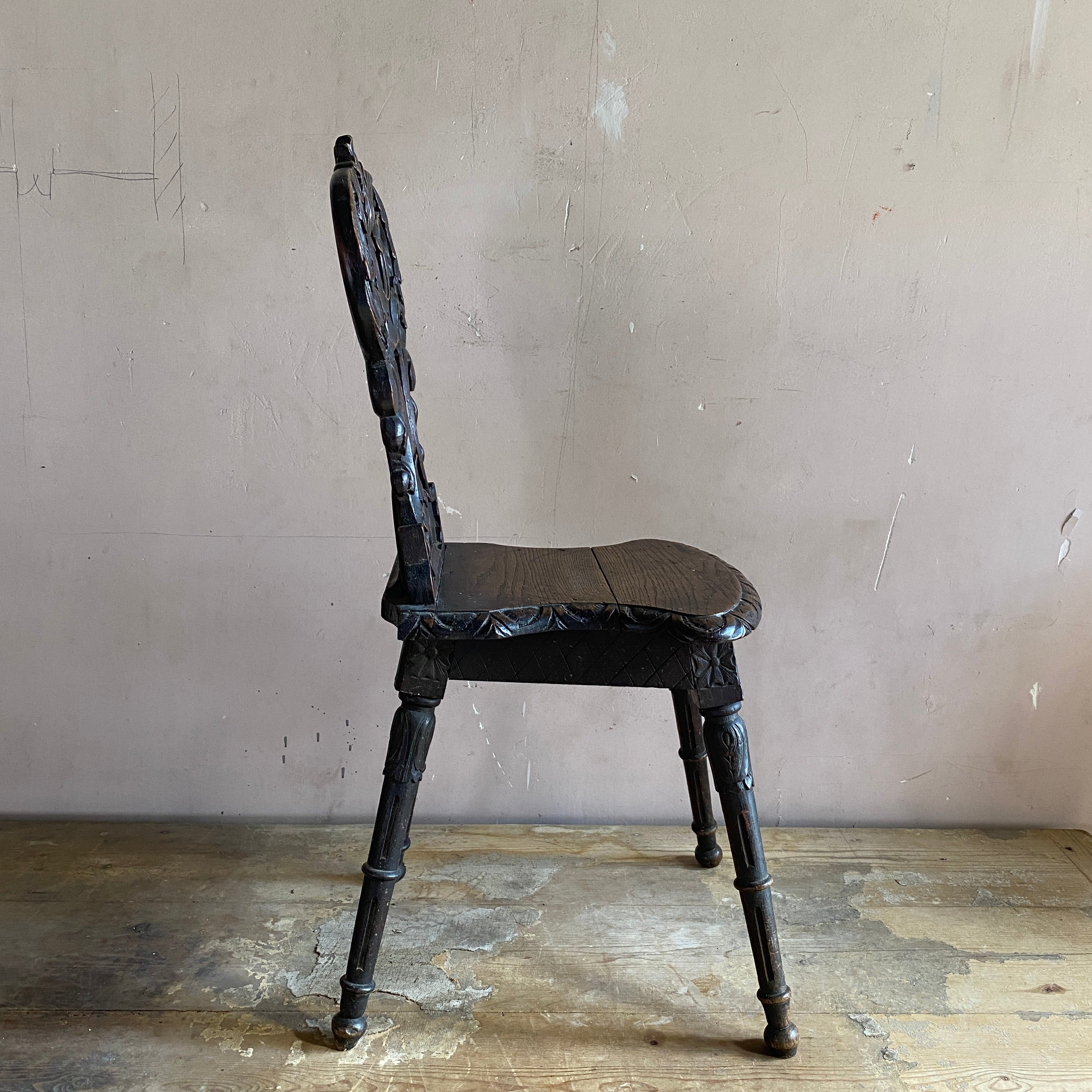 This antique carved chair is from the Alsace department of France. Dating from the mid 1850's, its hand carved dark wood is an impressive artisan creation. This style is traditional, but each piece is unique.