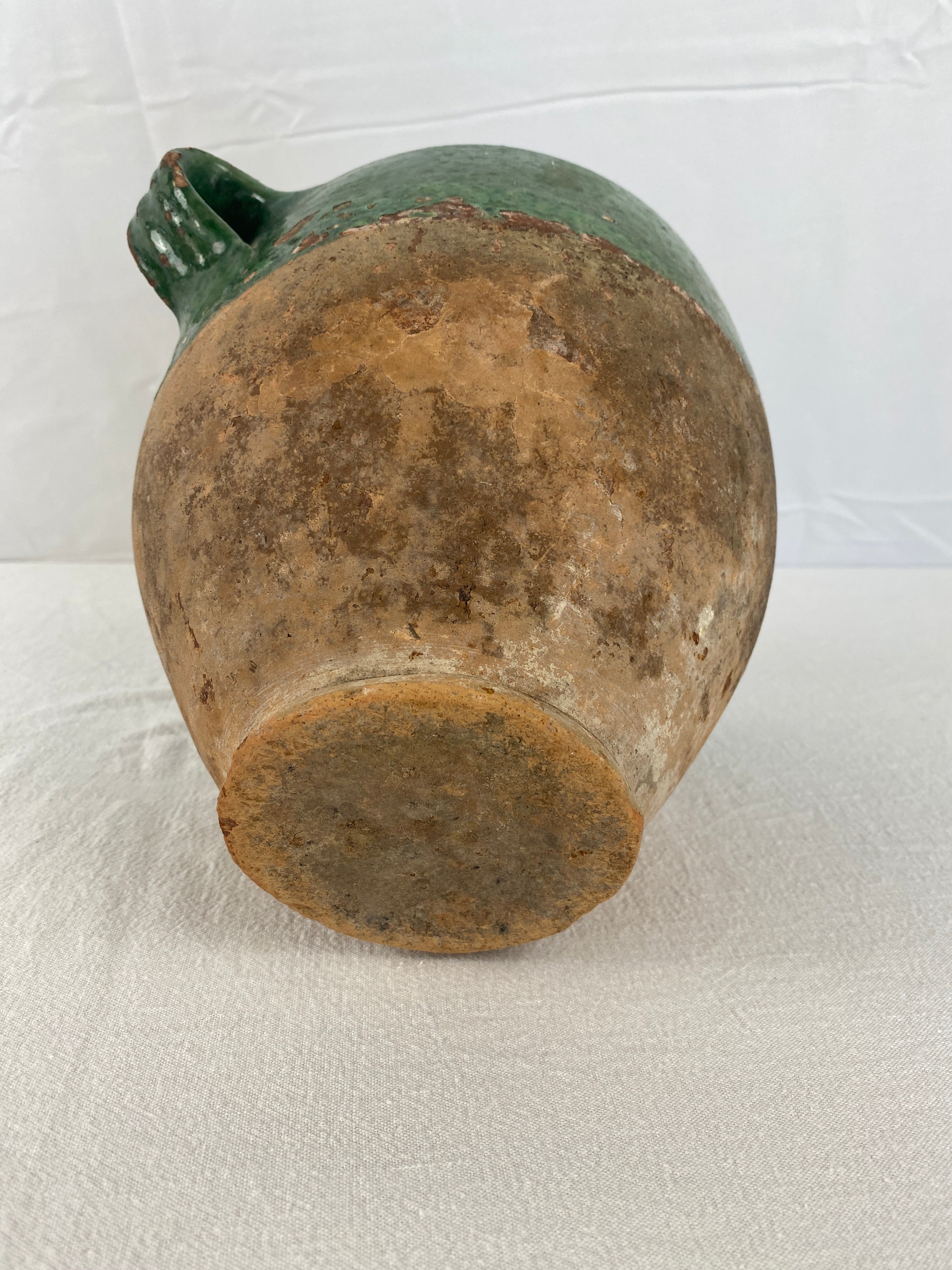 The top half has a green glaze with great patterns from wear, various marks and indentations and a beautiful patina. The bottom half is unglazed.