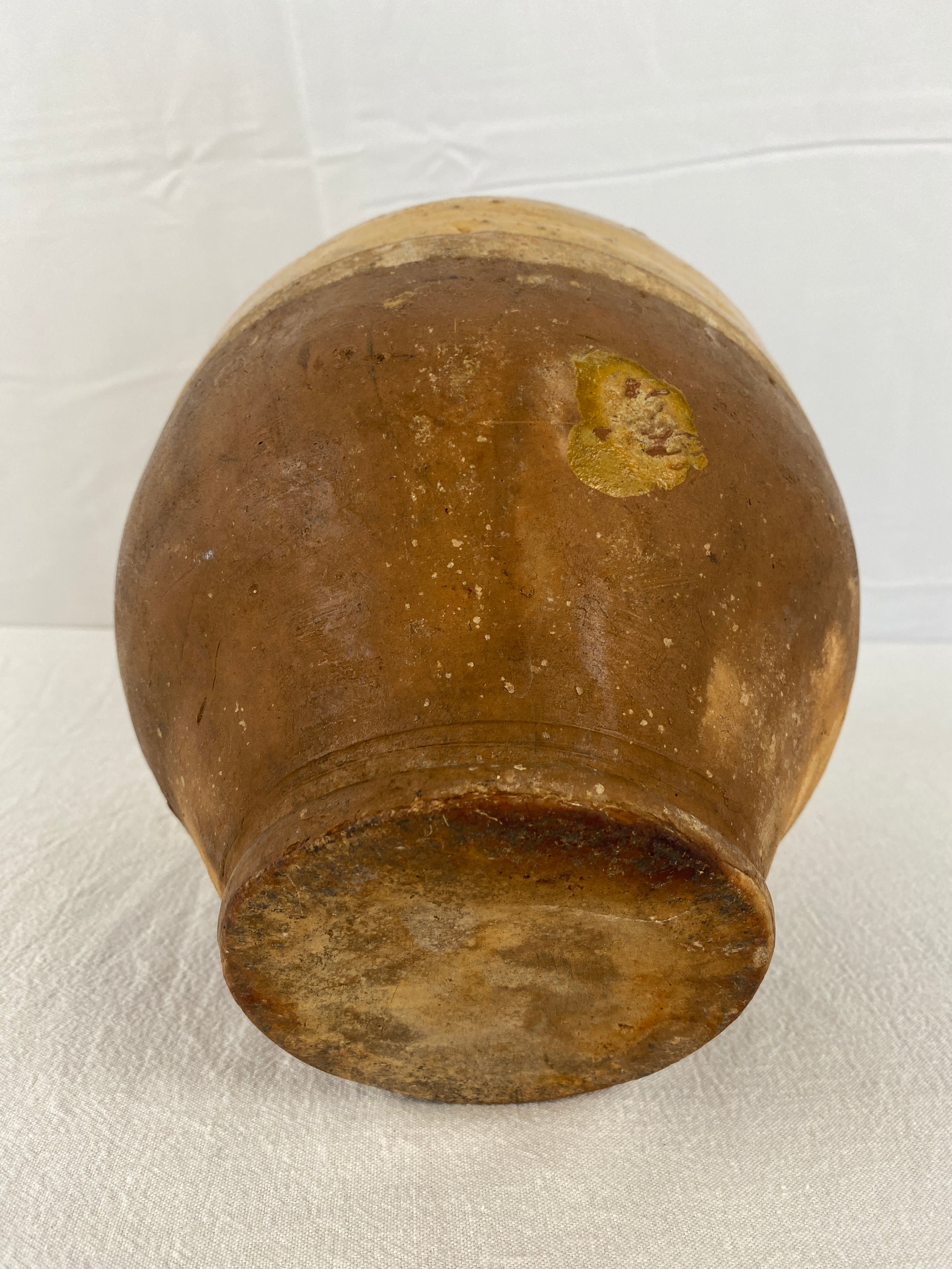 The top half has a yellow glaze and the bottom half is unglazed. This is typical of the confit pot of this era, as they were buried in the ground to keep the food cool.
