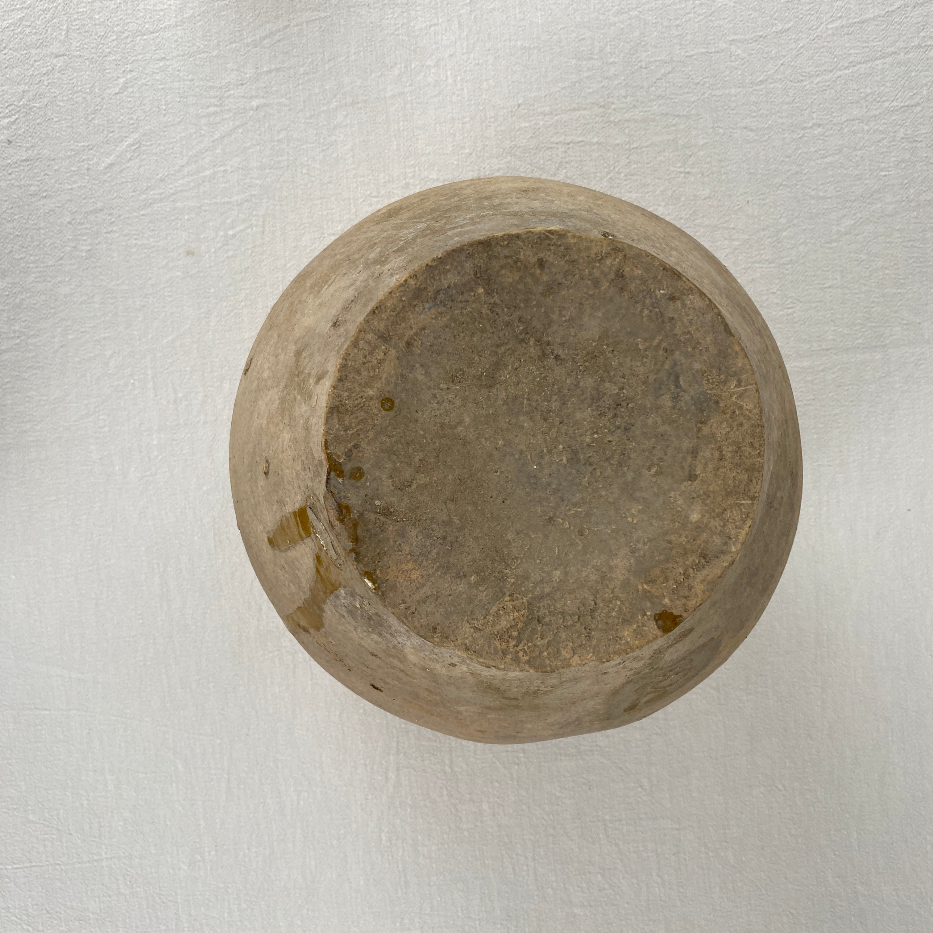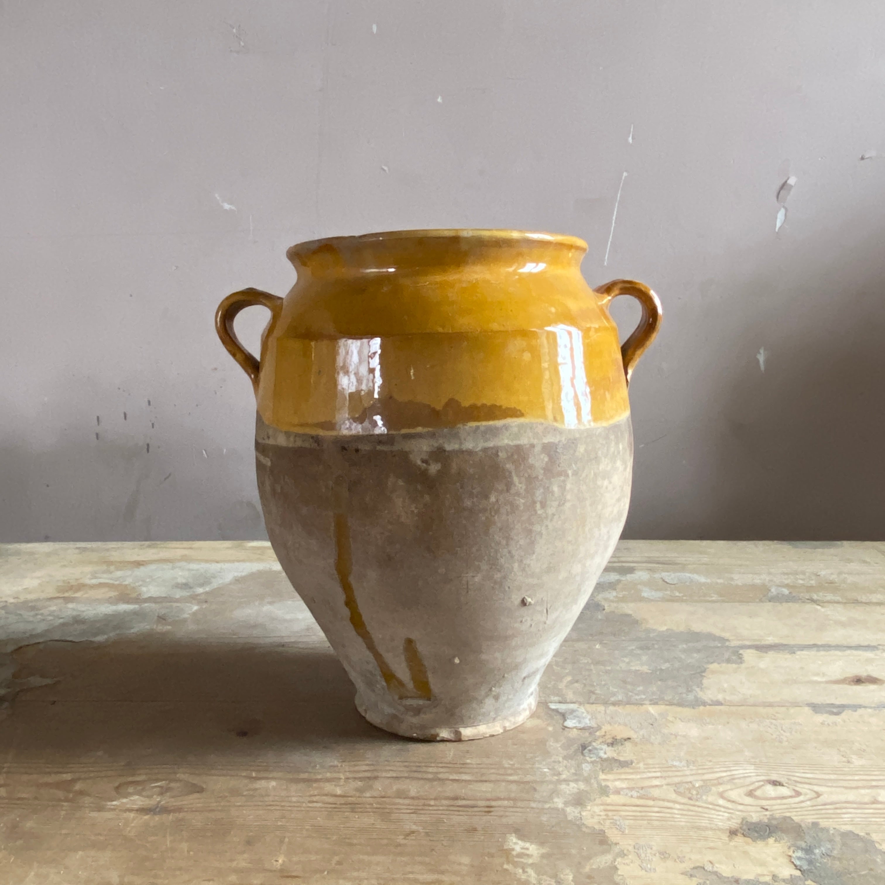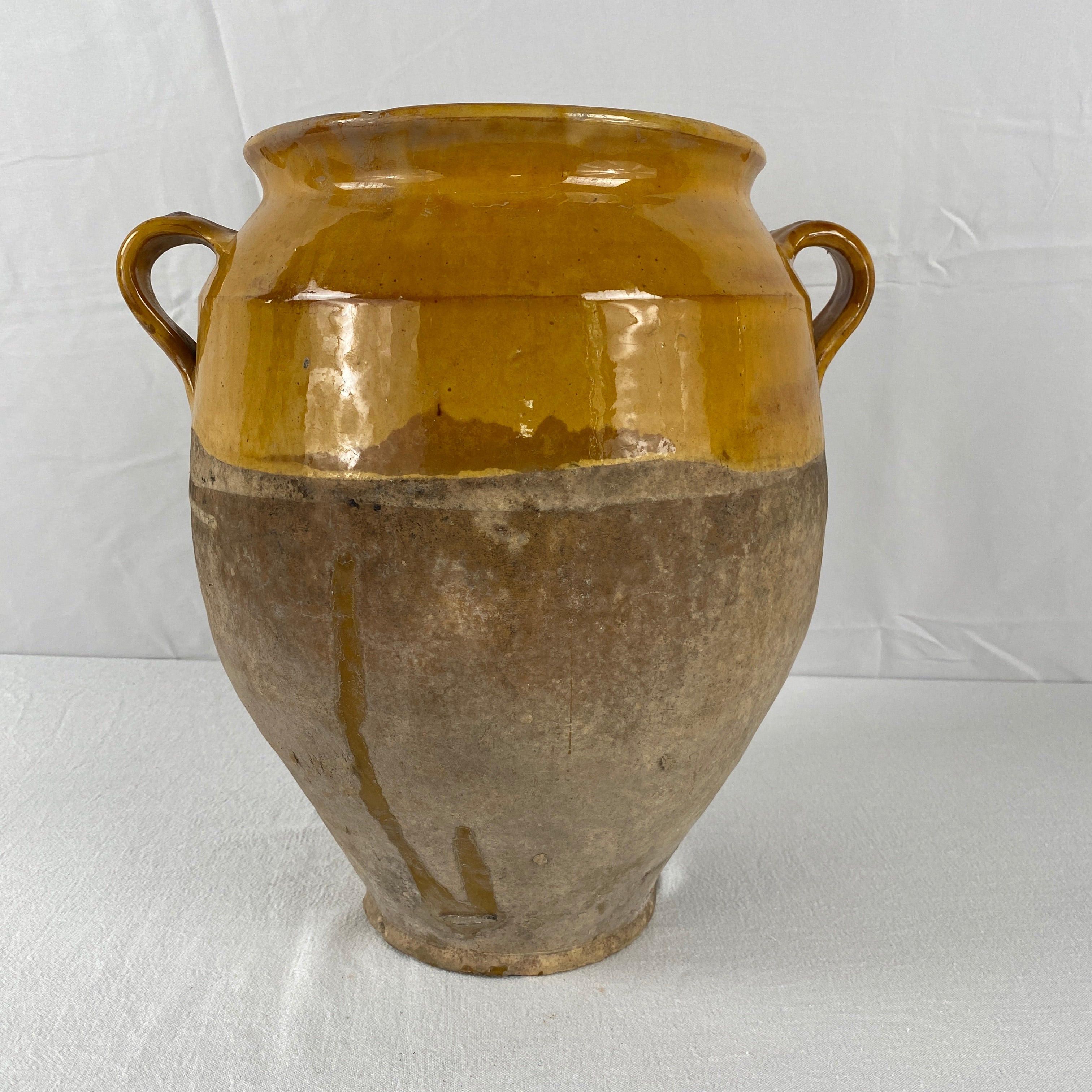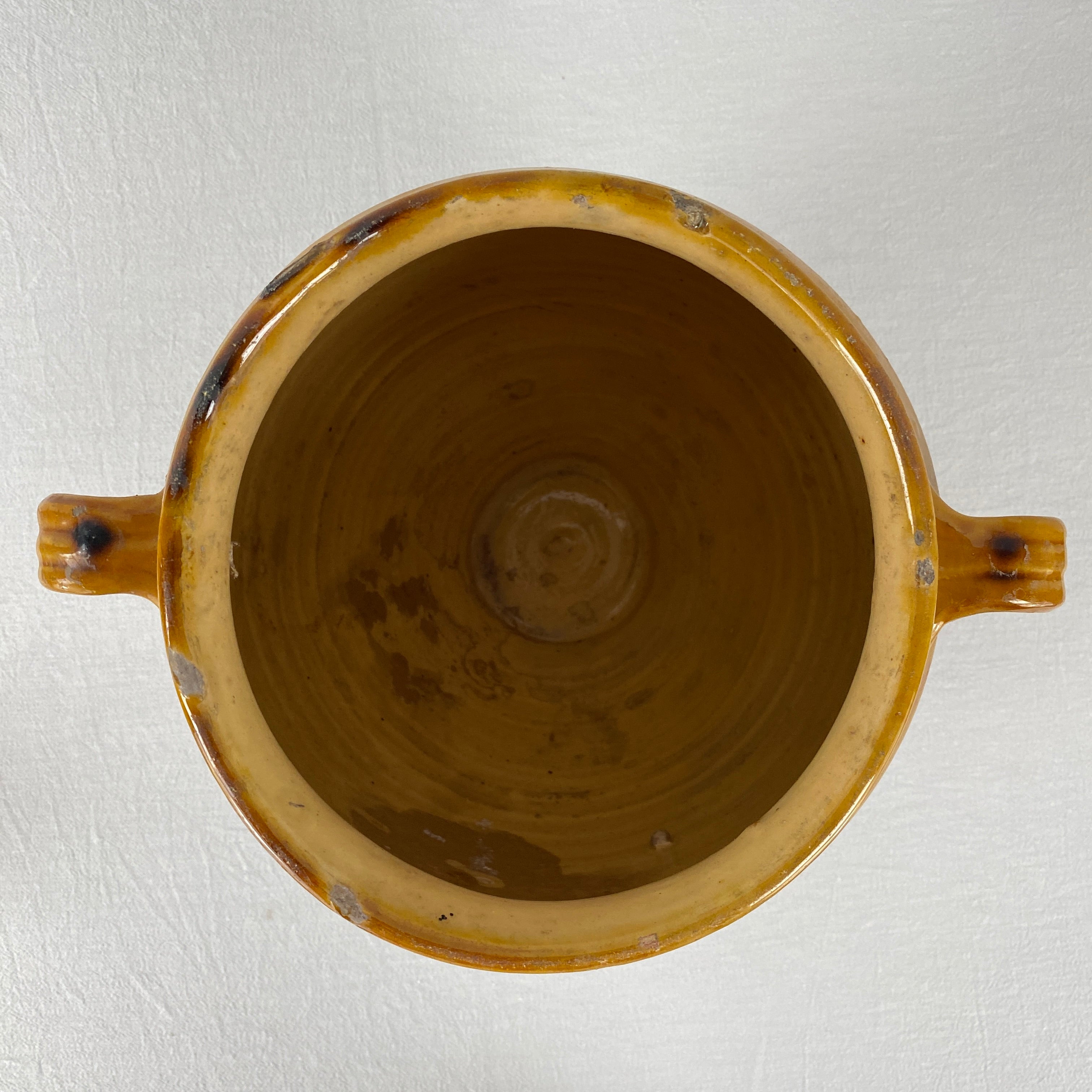 The top half has a yellow glaze and the bottom half is unglazed. This is typical of the confit pot of this era, as they were buried in the ground to keep the food cool.