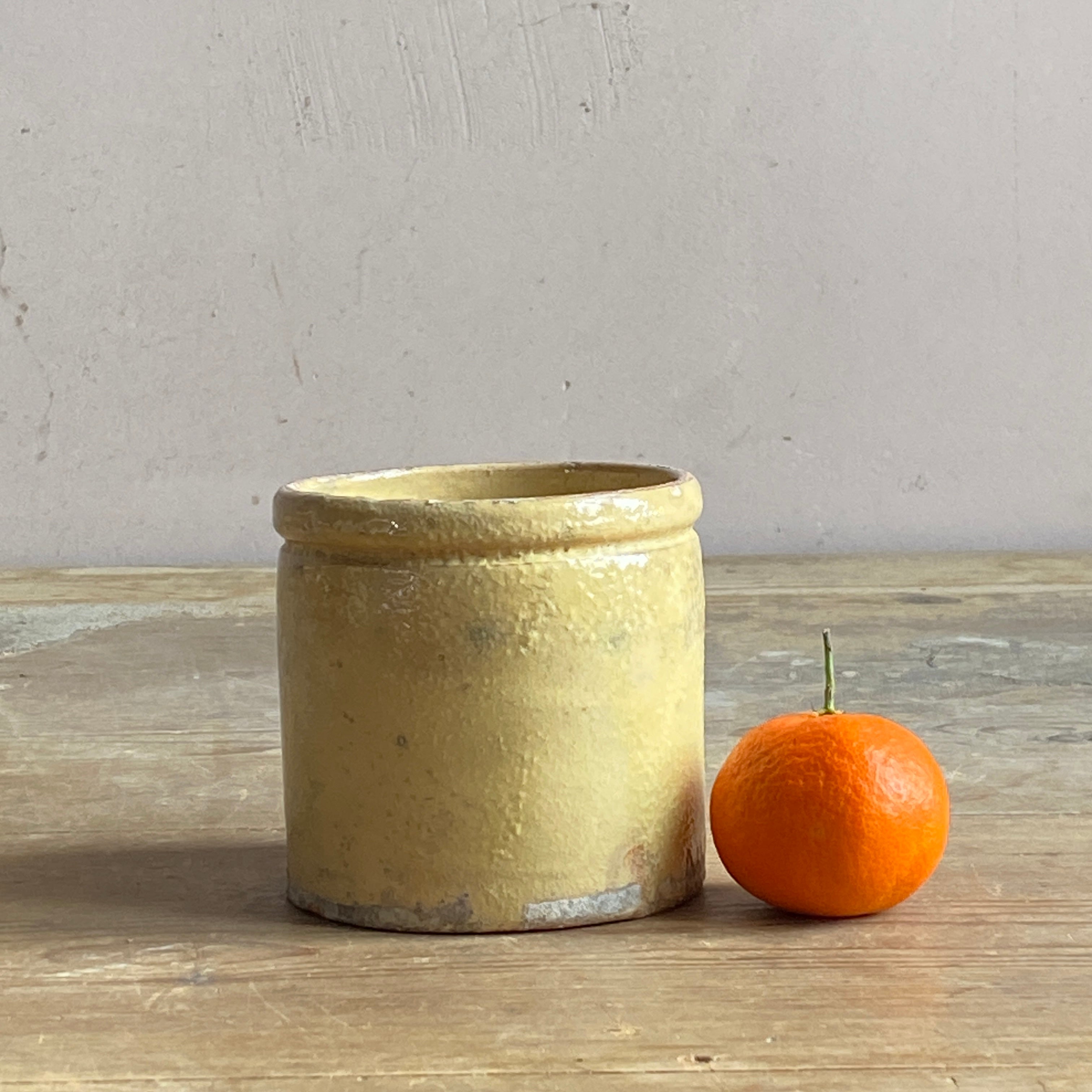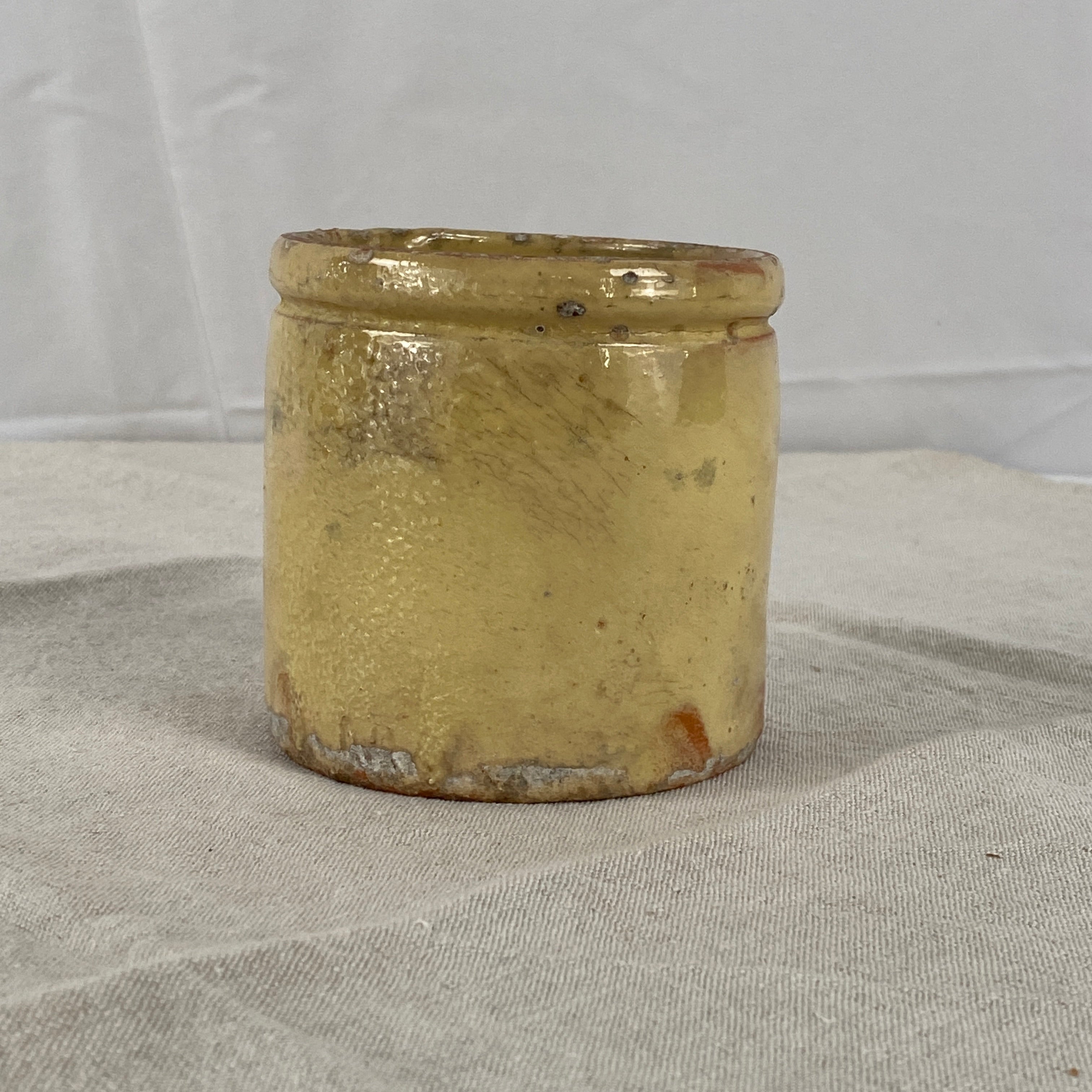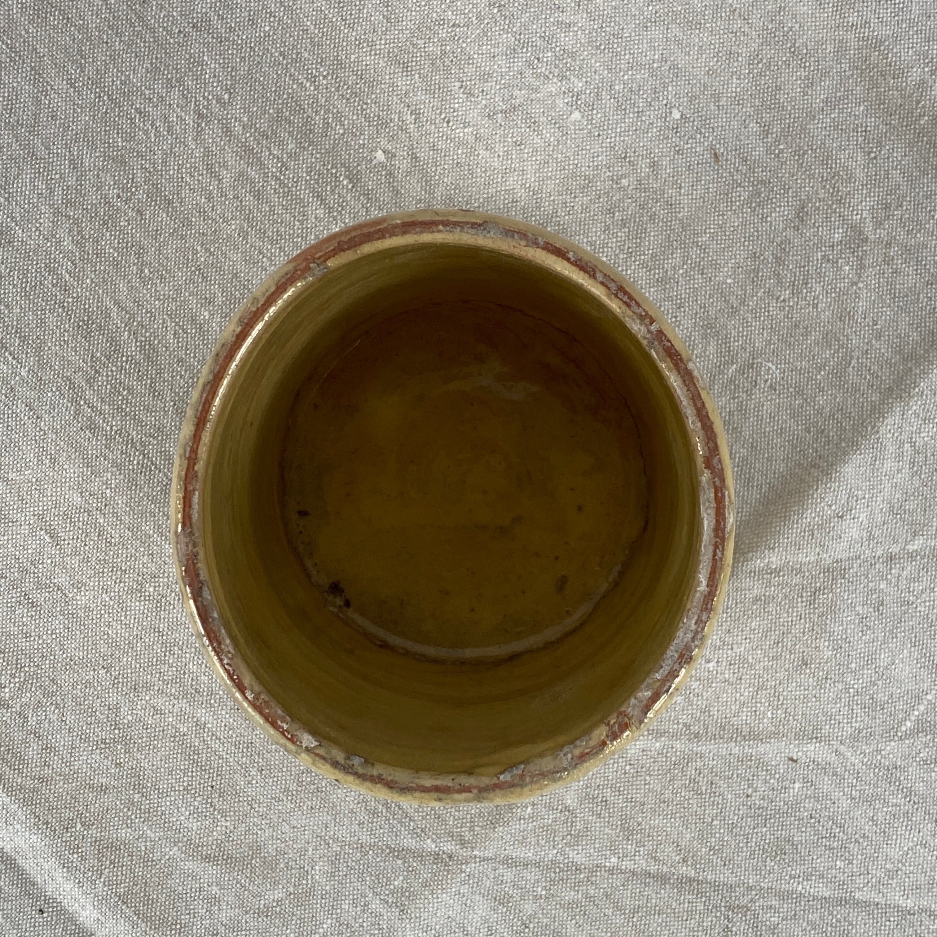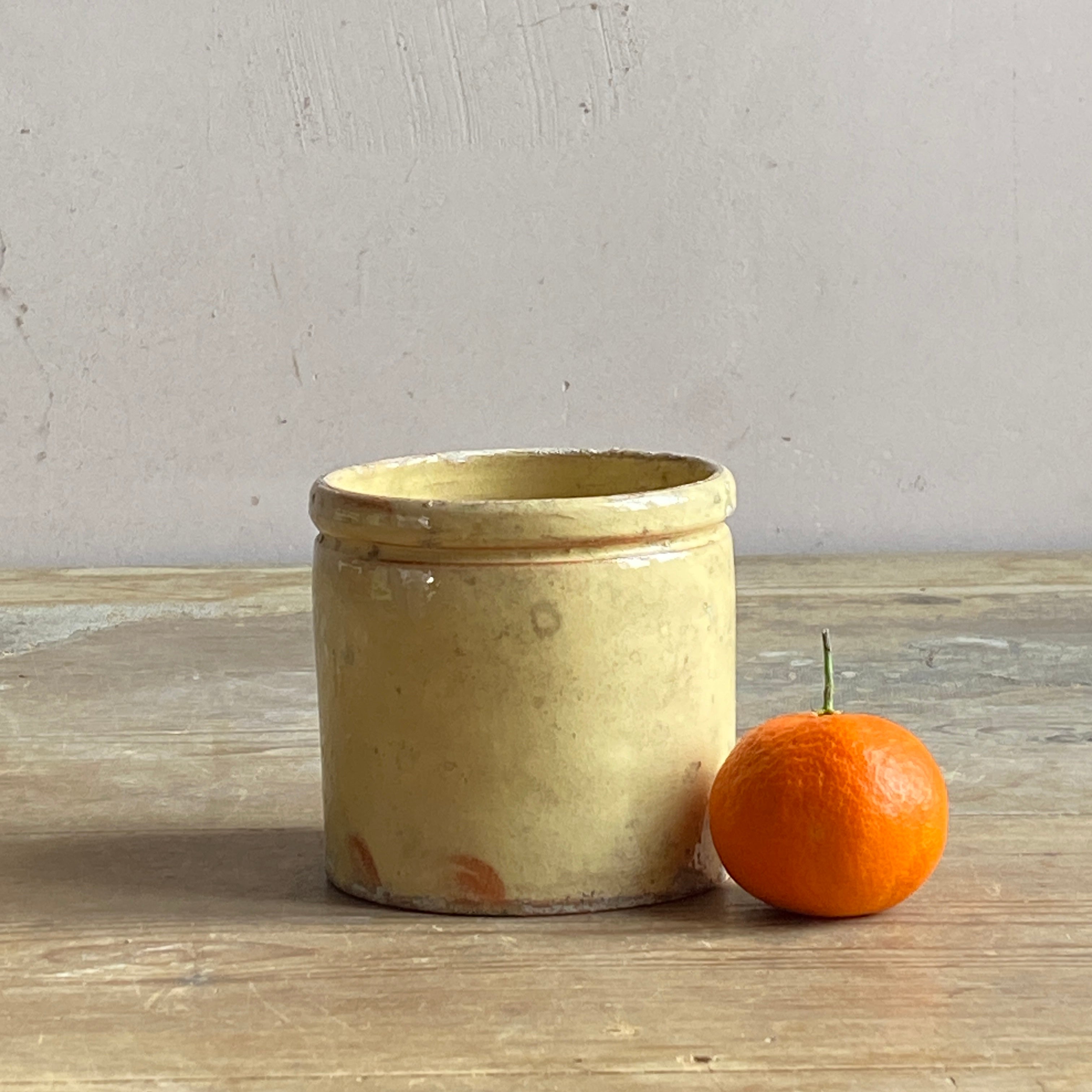 Dating from the late 19th Century, this confiture pot is fully glazed on the interior and exterior in a beautiful pale yellow. Made from terracotta, the glaze is mottled and aged with parts of the terracotta showing through.