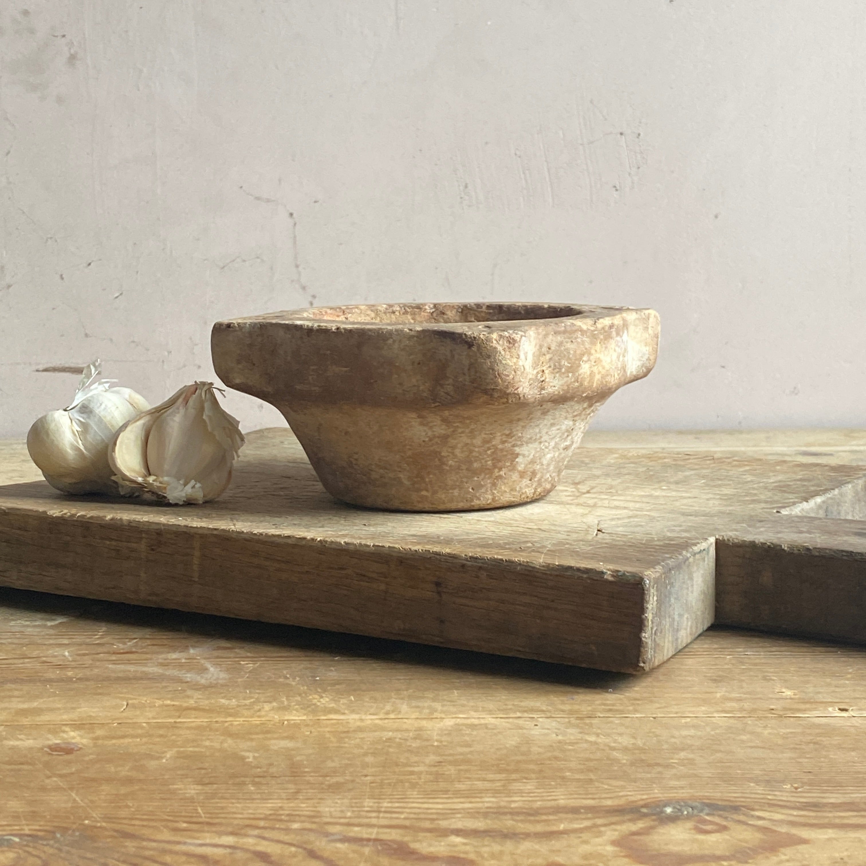 This is a very old and well used item with many decades of use. As such, it has age-related marks, scratches and scrapes which enhance its rustic appeal. Sold without the chopping board.