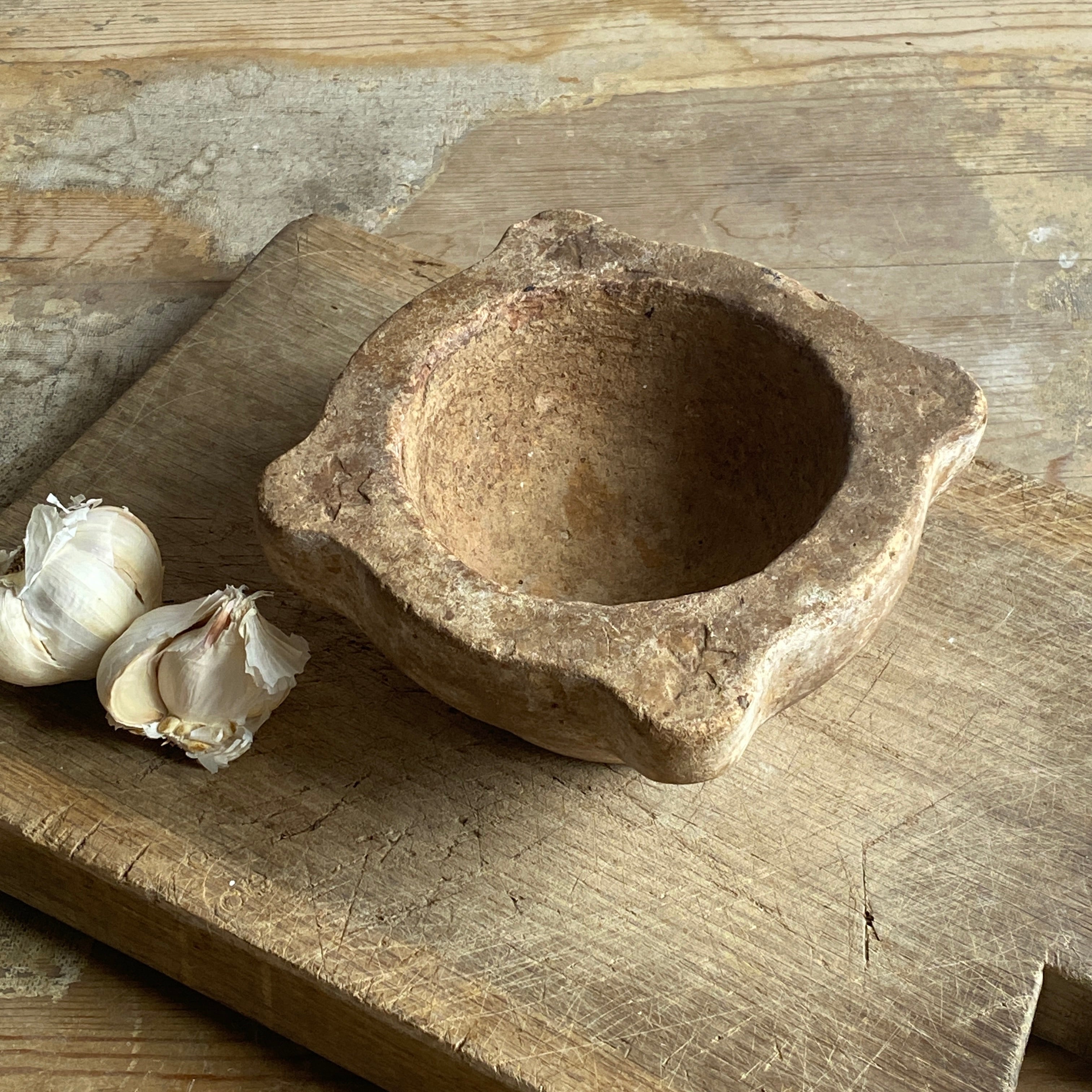 This antique French mortar is quadrilobed with star patterns engraved on each lobe