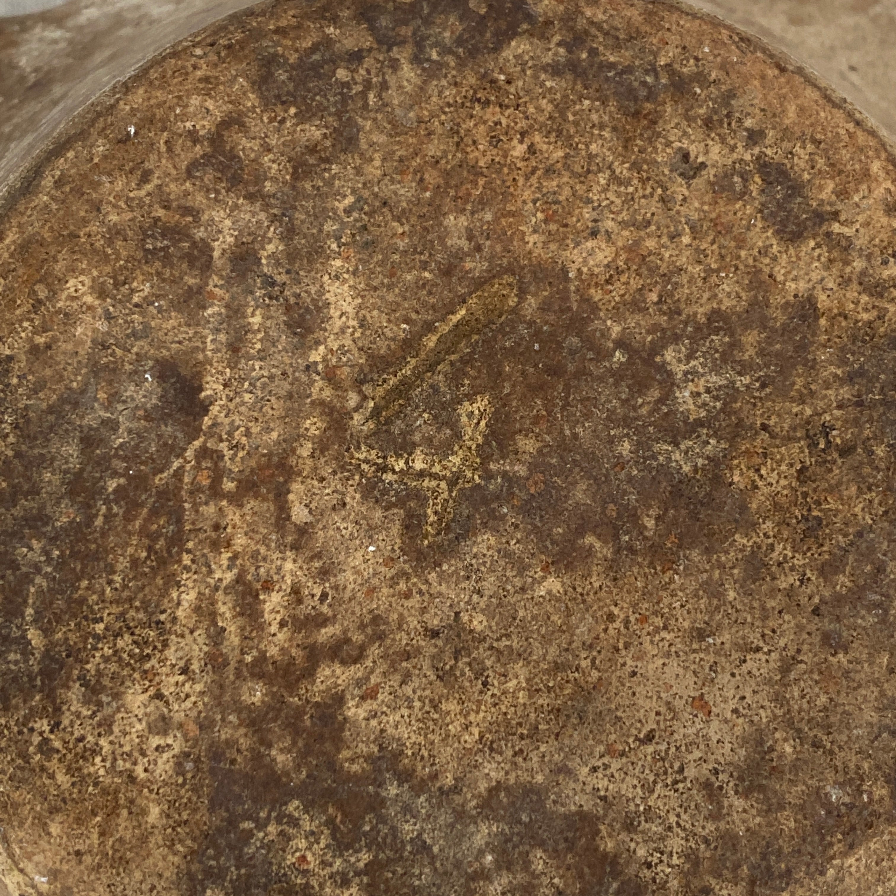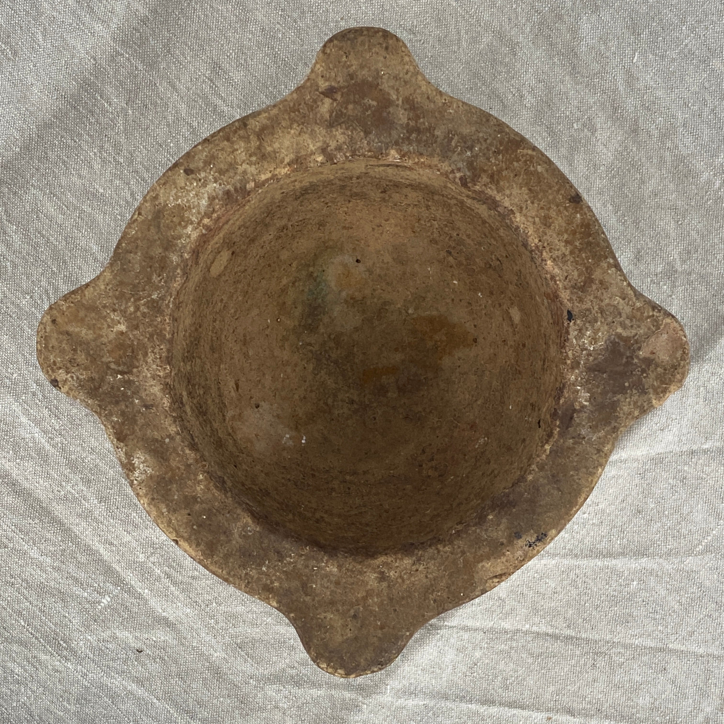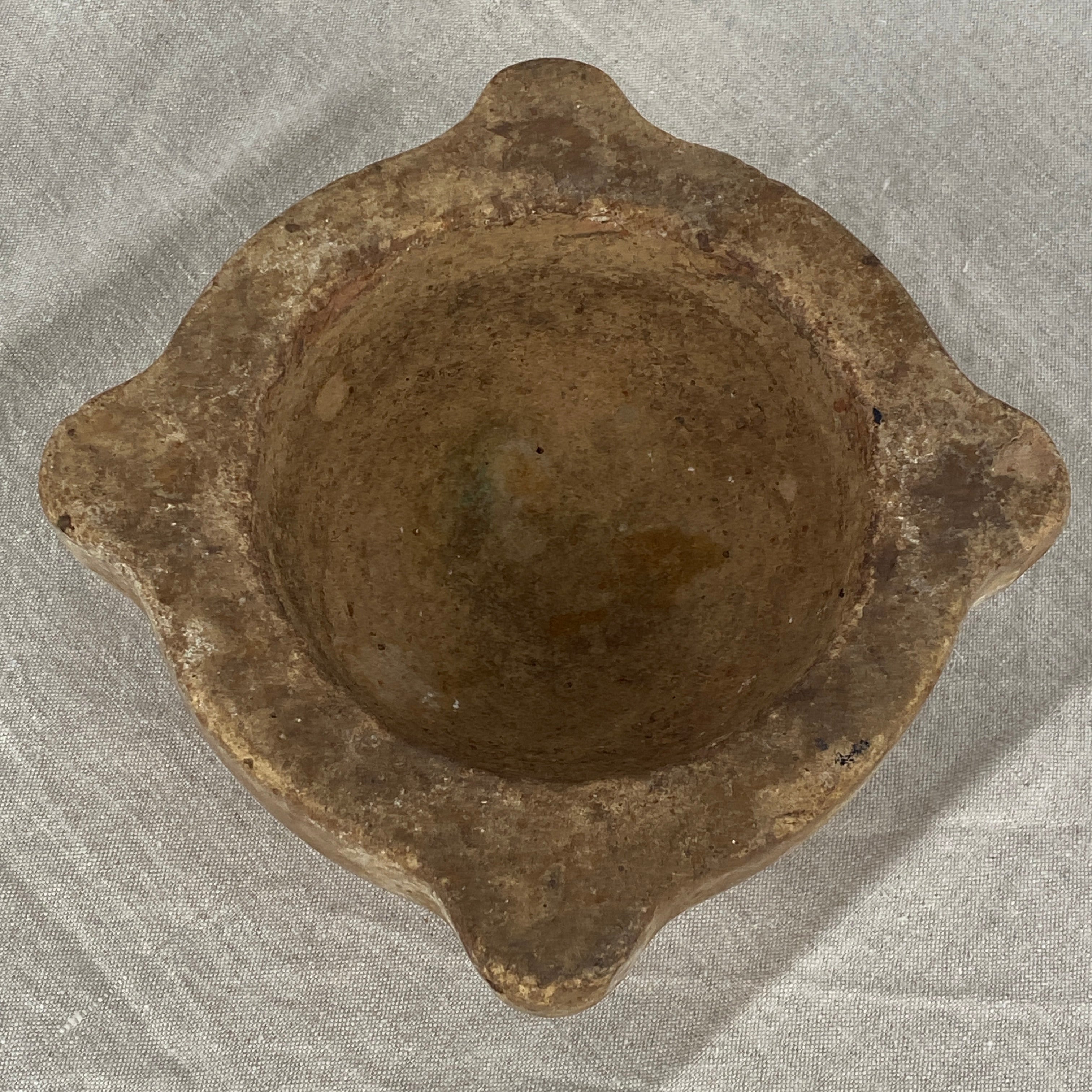 This brown mortar has subtle marks and indentations, a warm appearance and a pleasing smooth texture. Its patina shows centuries of use with its worn finish.