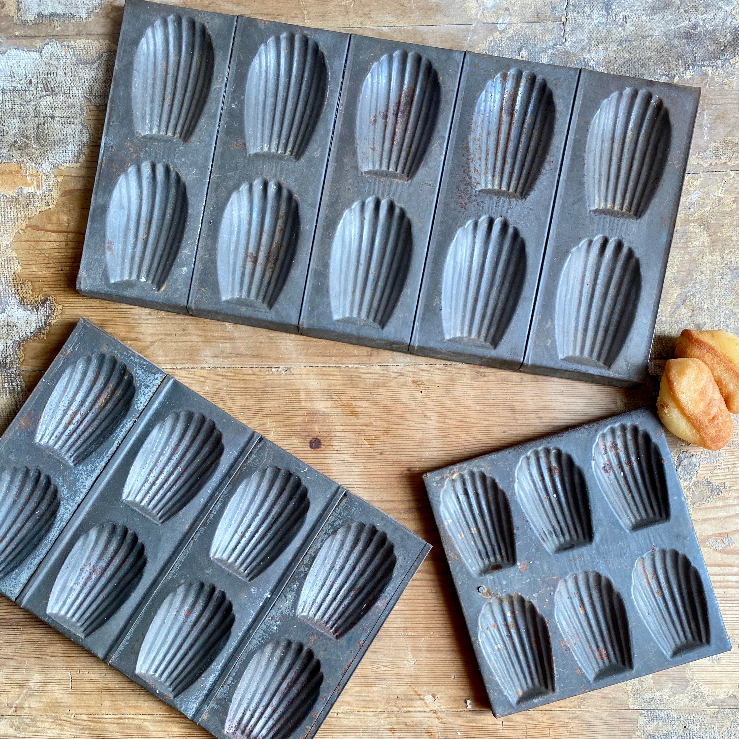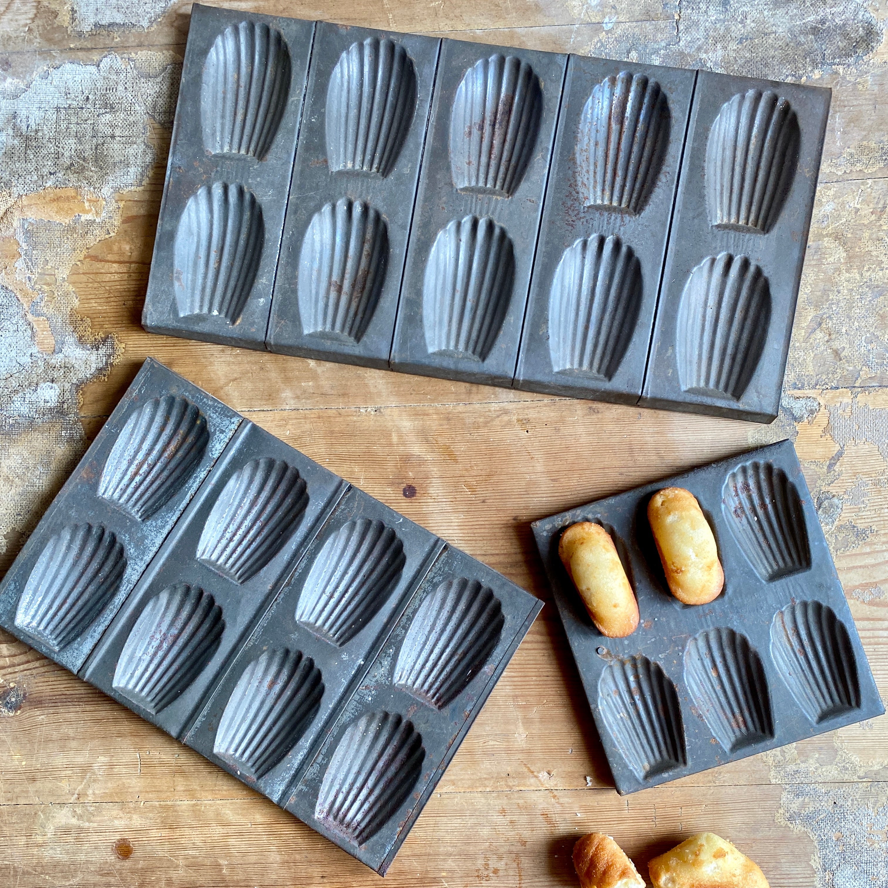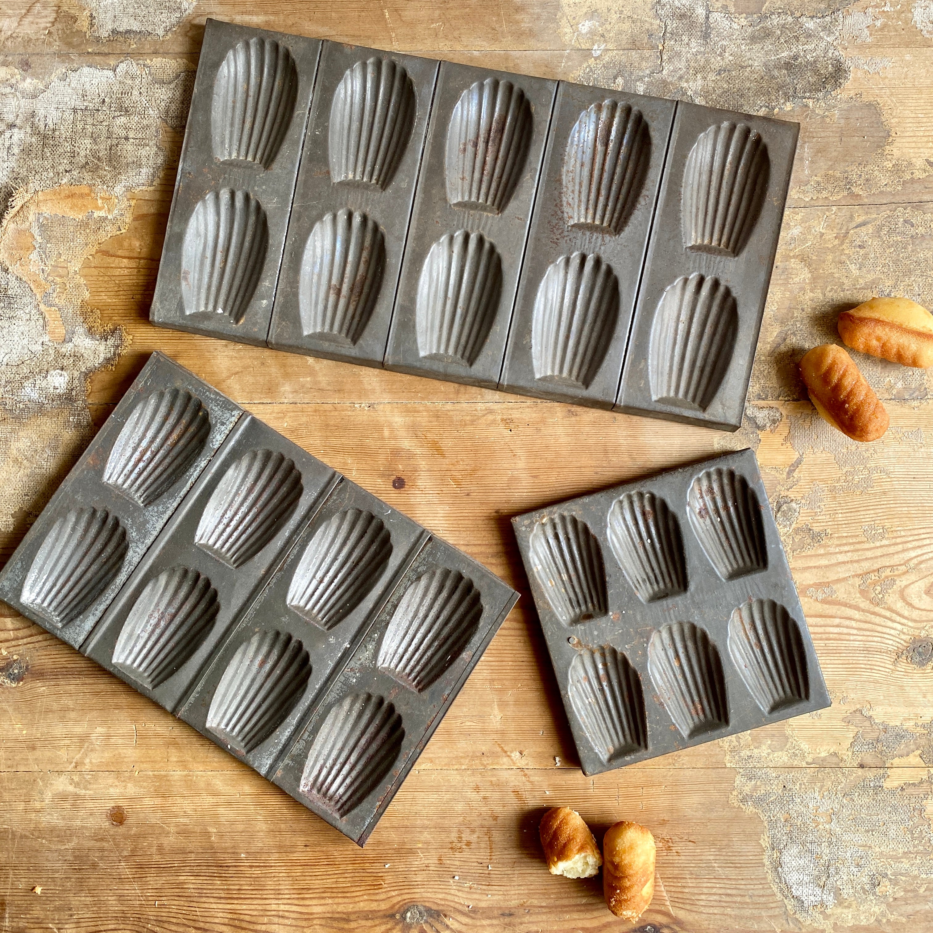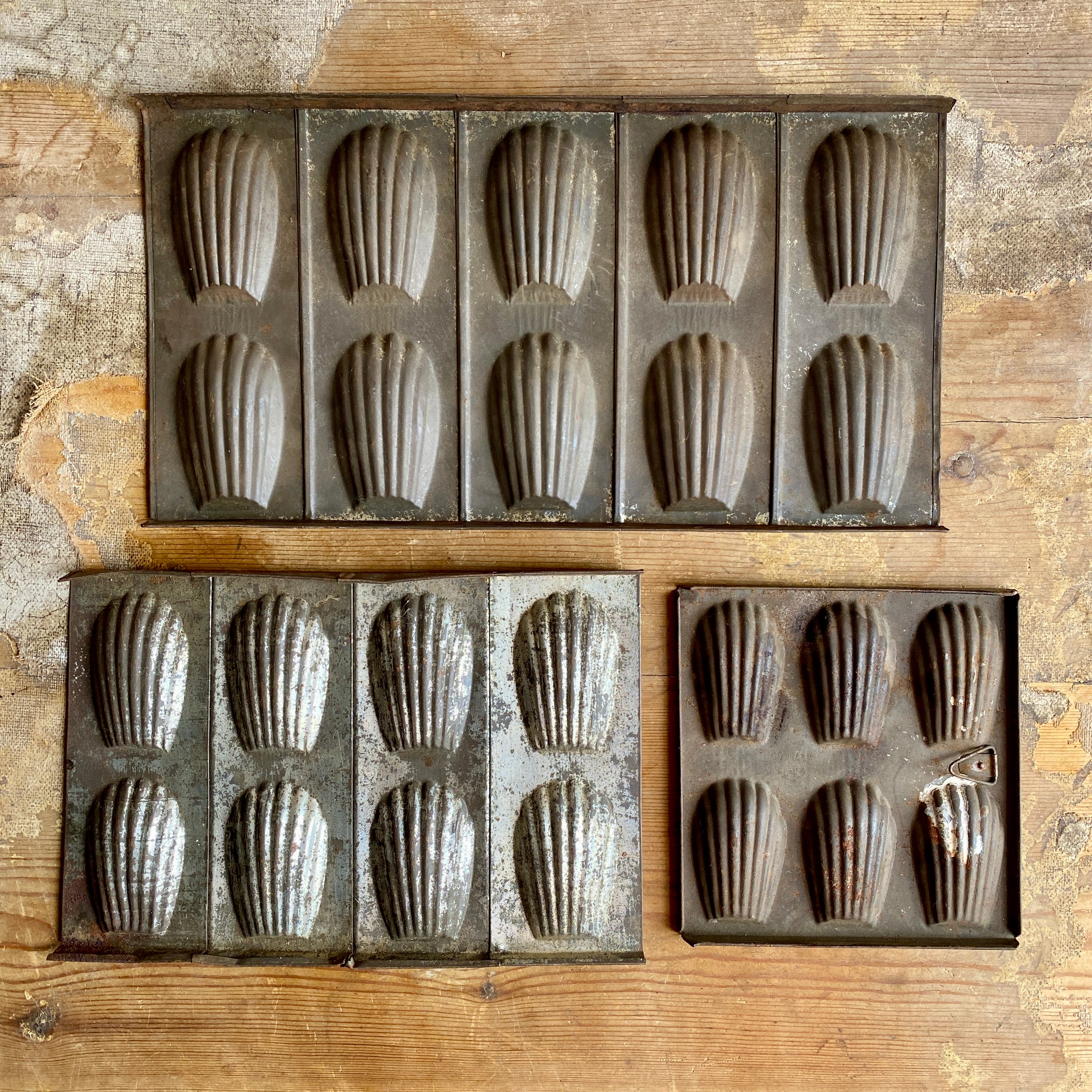 This trio of vintage madeleine trays once were used for making the famous French cake. Although no longer suitable for use in baking, they make a great decorative display piece.