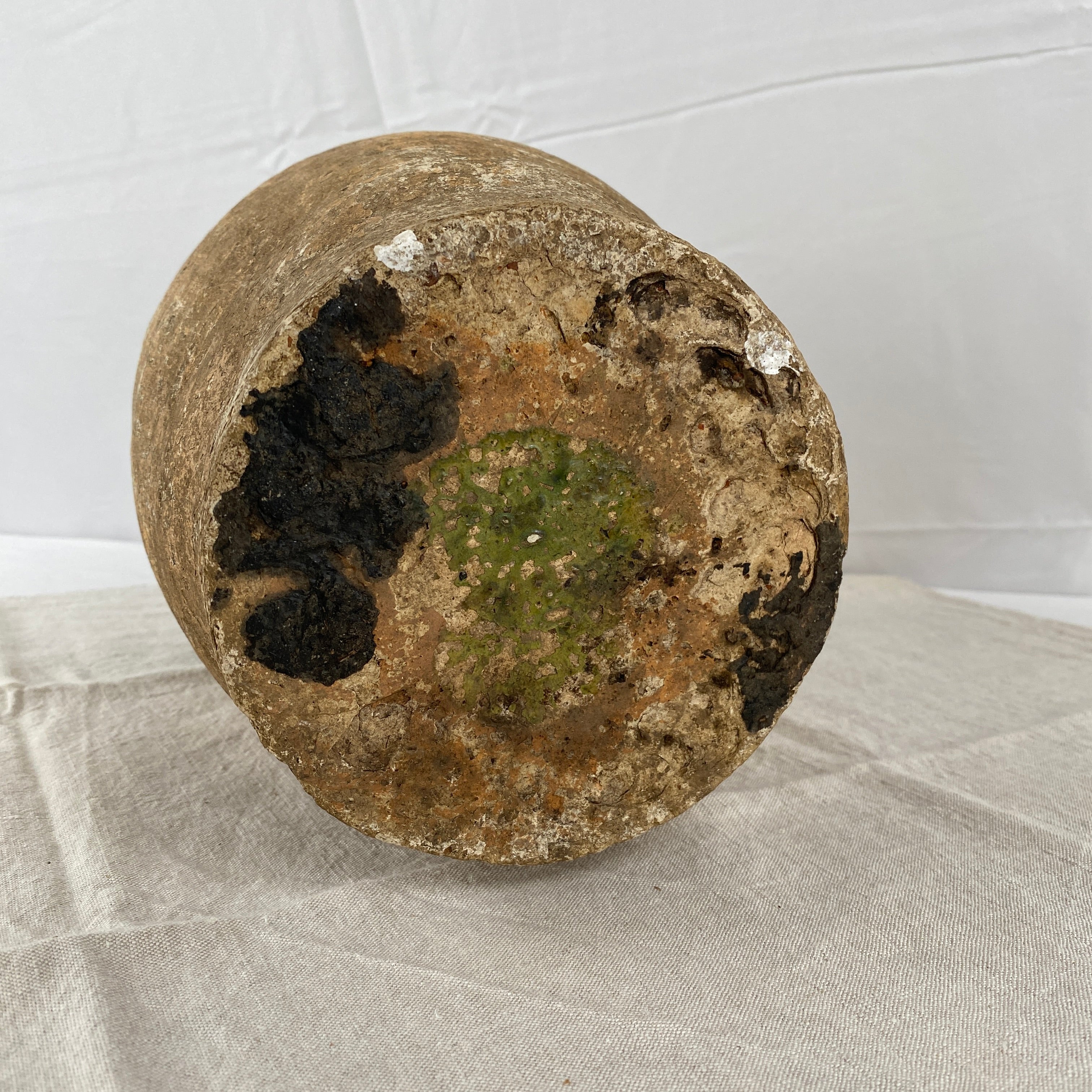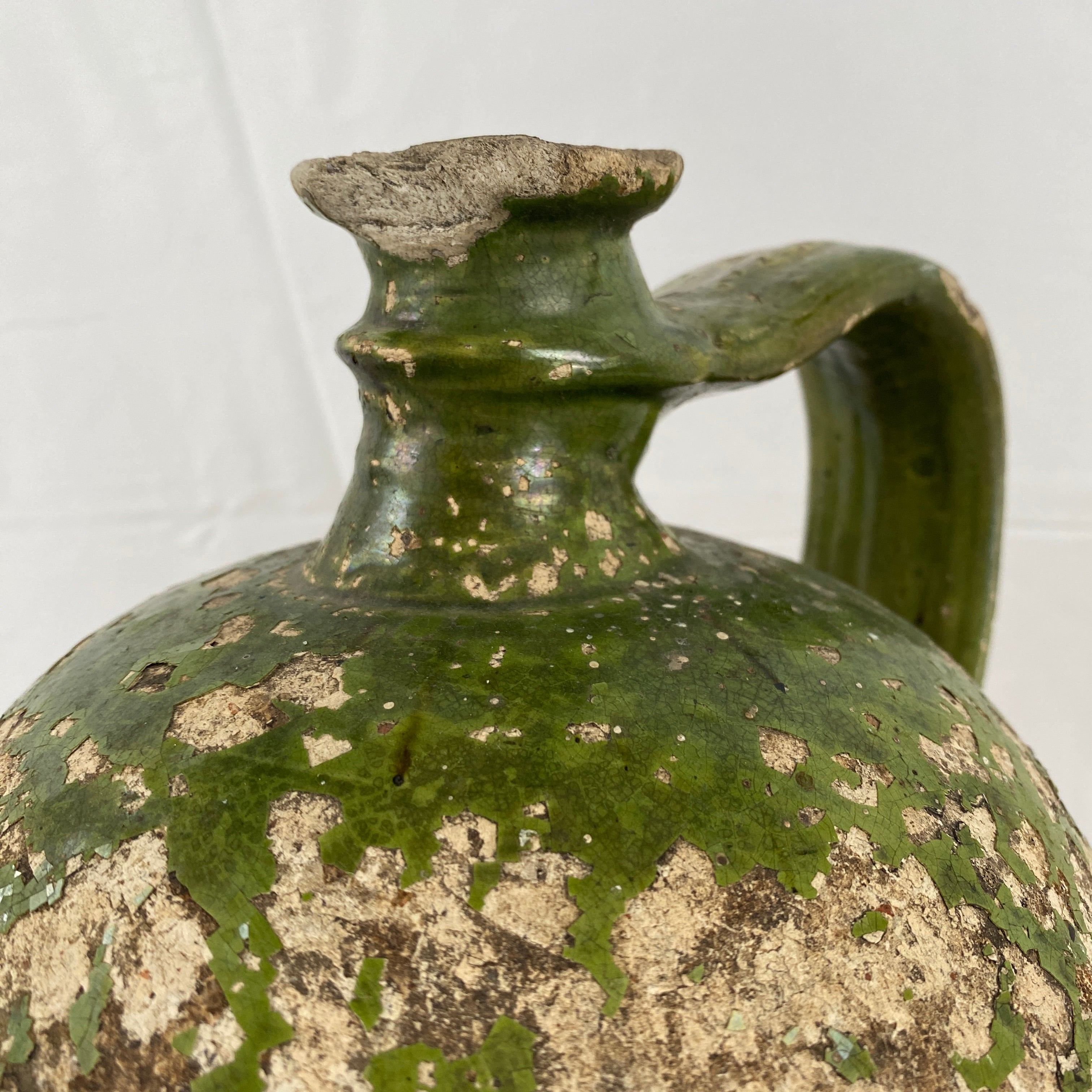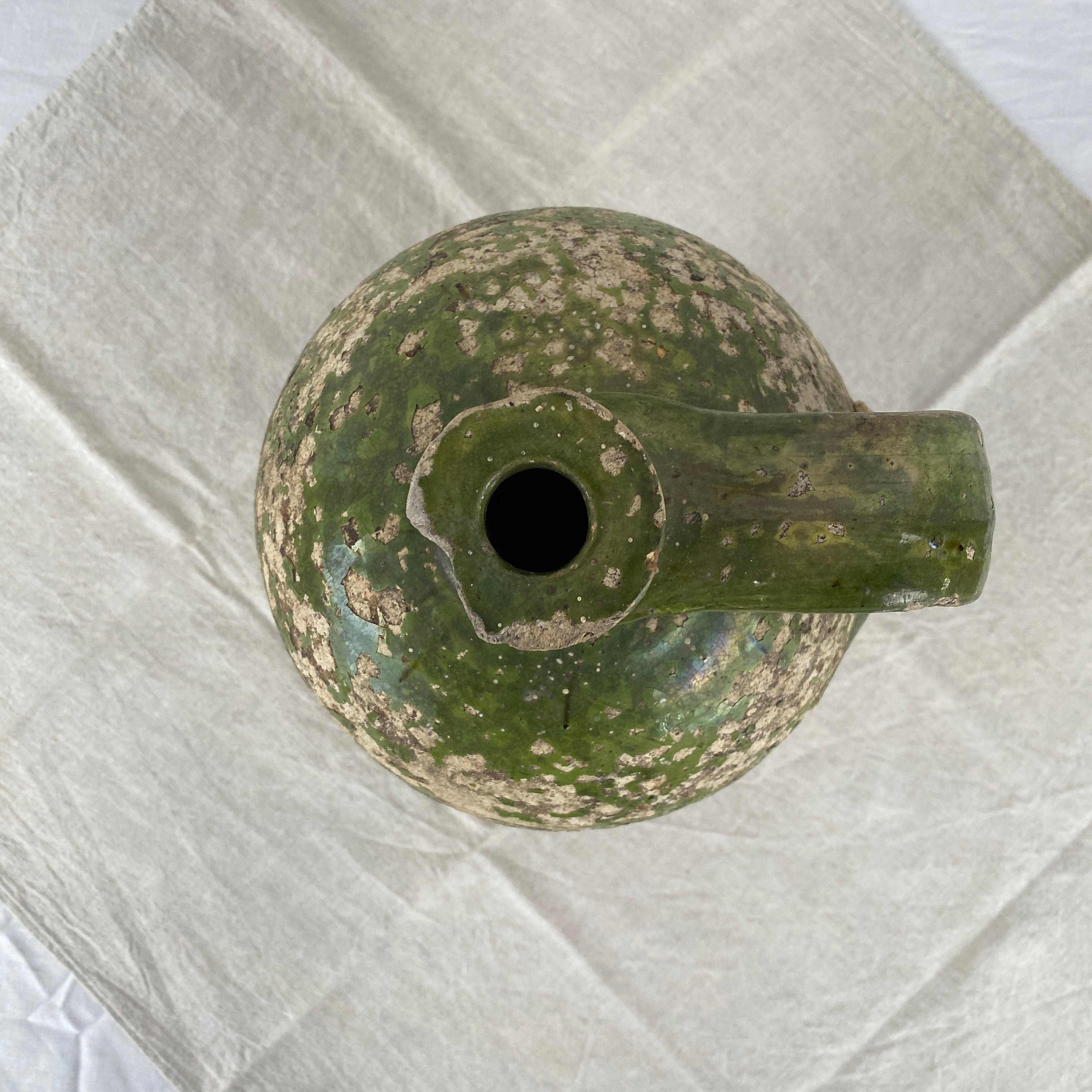 The top half has a green glaze mottled by time. It has great patterns from wear, various marks, indentations and a beautiful patina. The bottom half is unglazed.