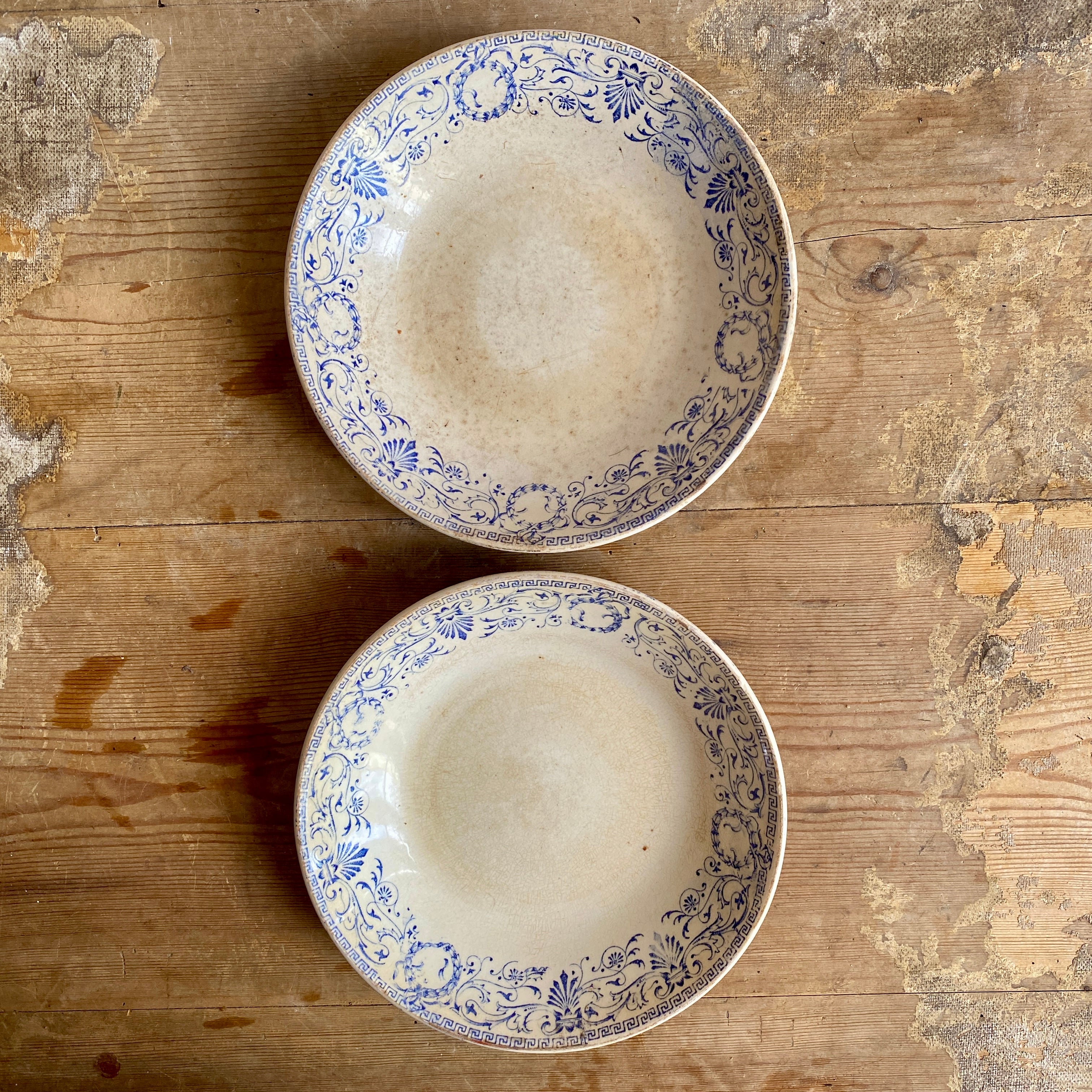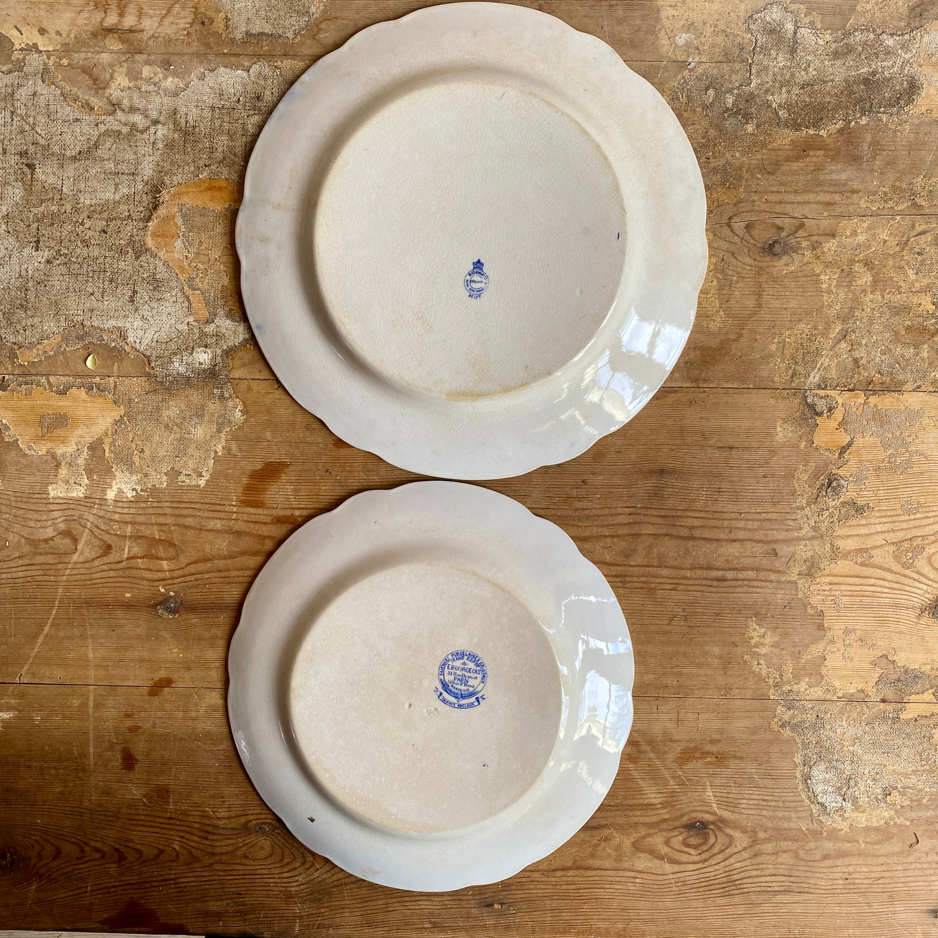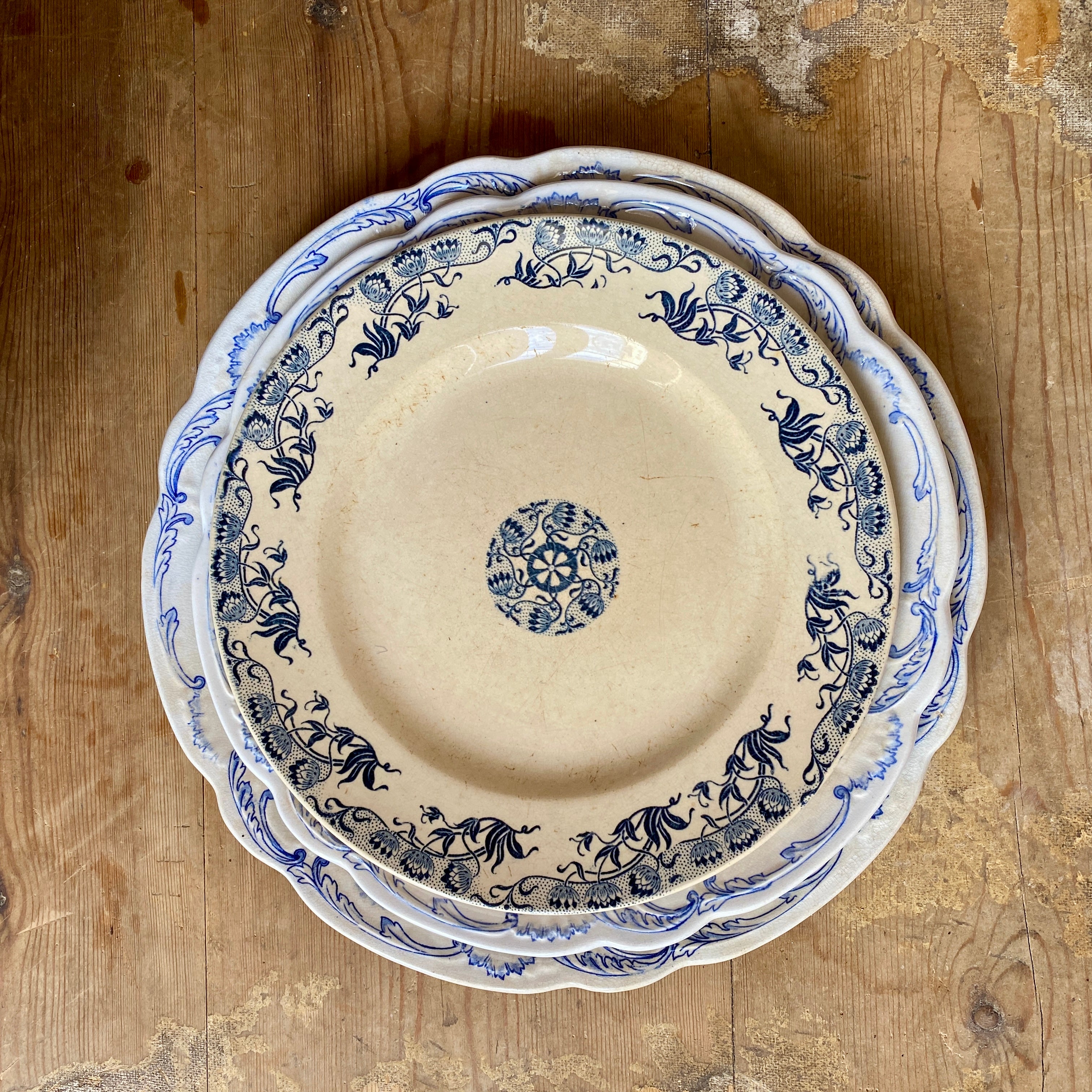With a beautiful crackle to the time-aged glaze, these plates and bowls feature a floral pattern in blue. Very usable but also endlessly decorative. They all have makers marks printed on the underside.