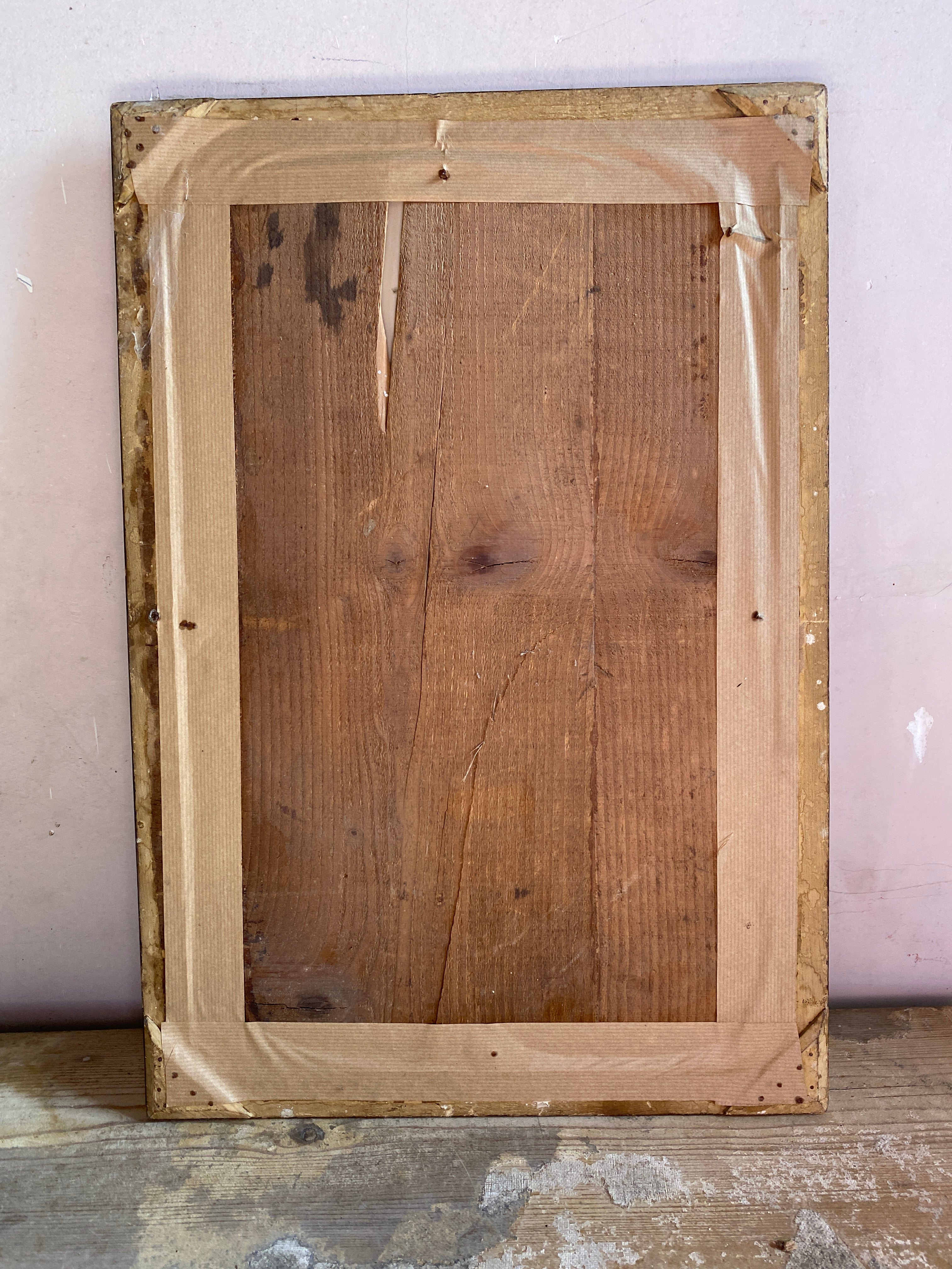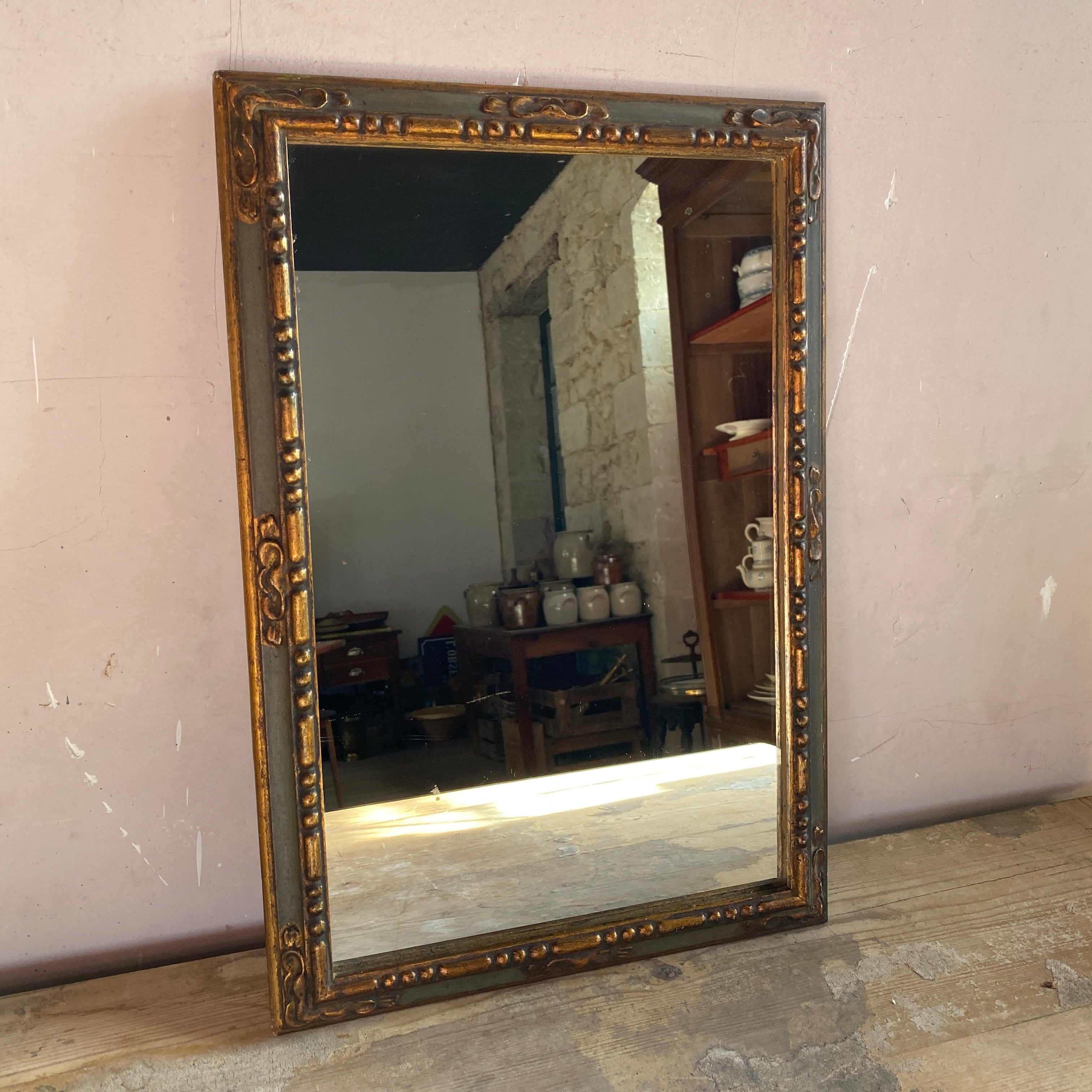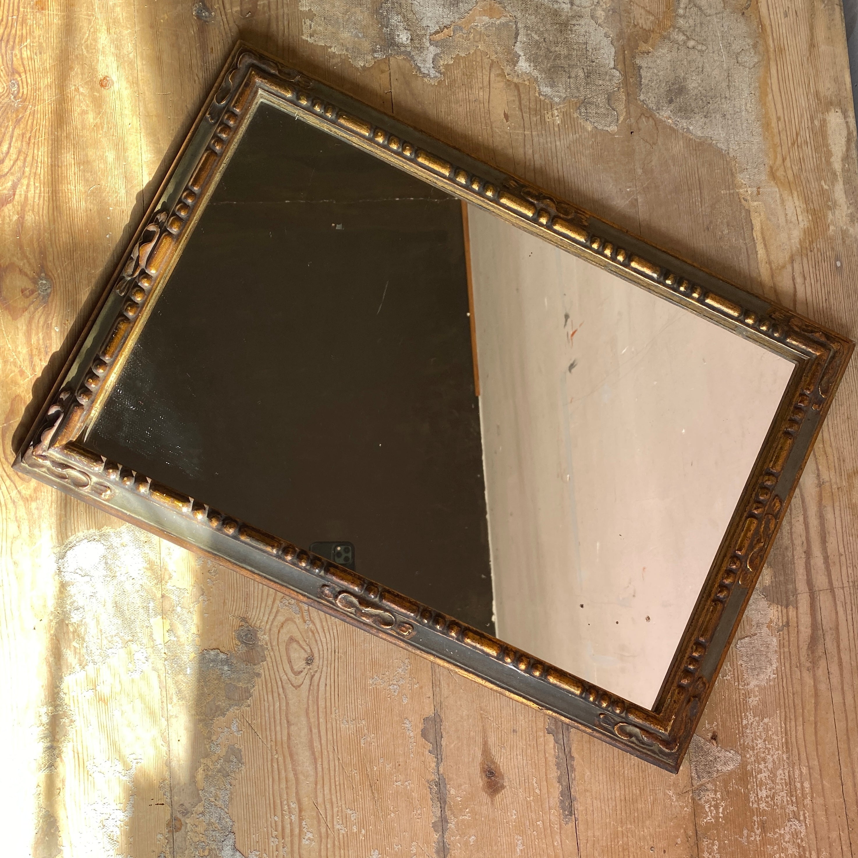 This wood frame mirror is decorated in olive green and warm gold. The mirror glass is intact and in fair condition with a few blemishes, as it has replaced during its lifetime which adds to its character.