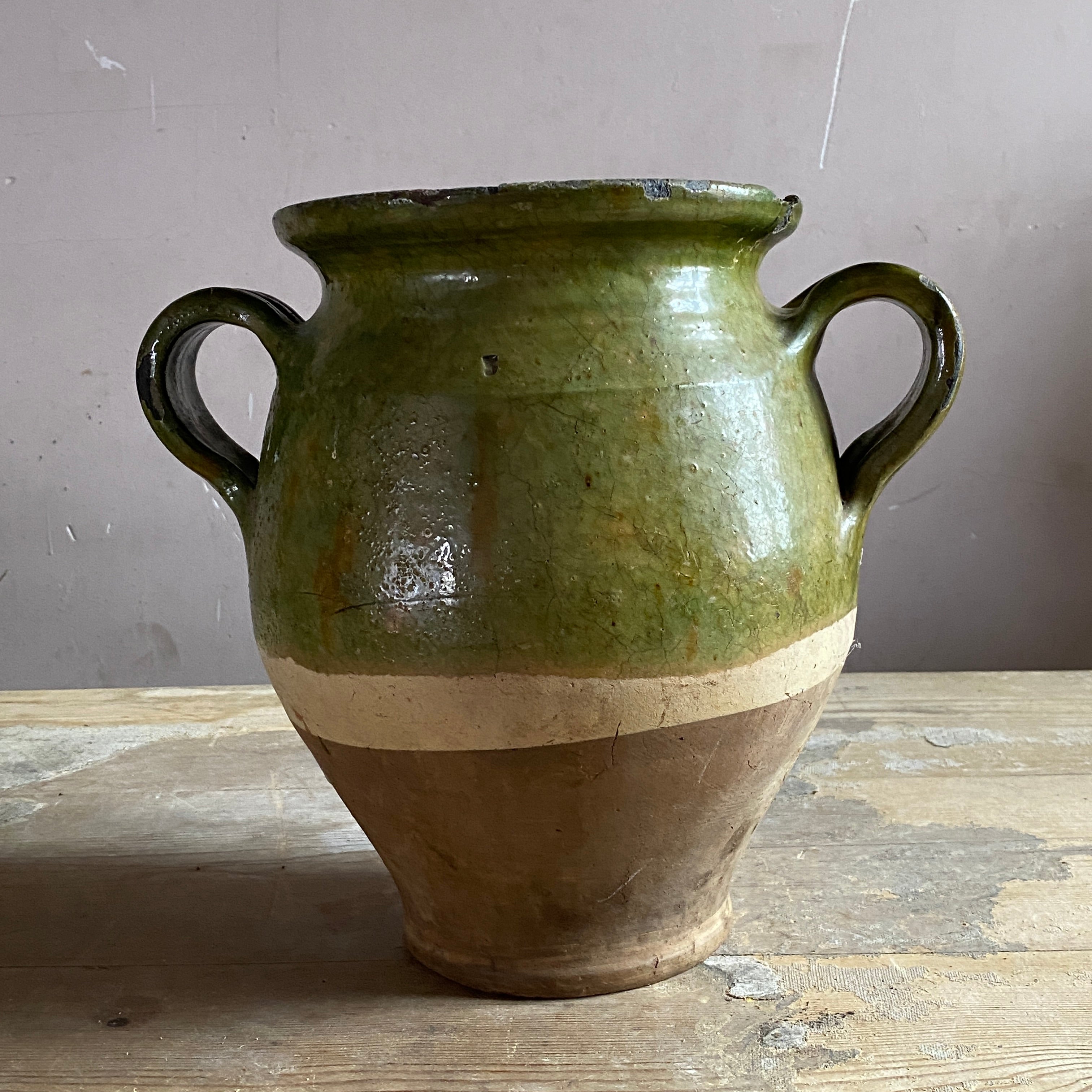 This style of green confit pots are even more rare than the yellow pots, due to their age and also the distinctive wide handles on this pot.