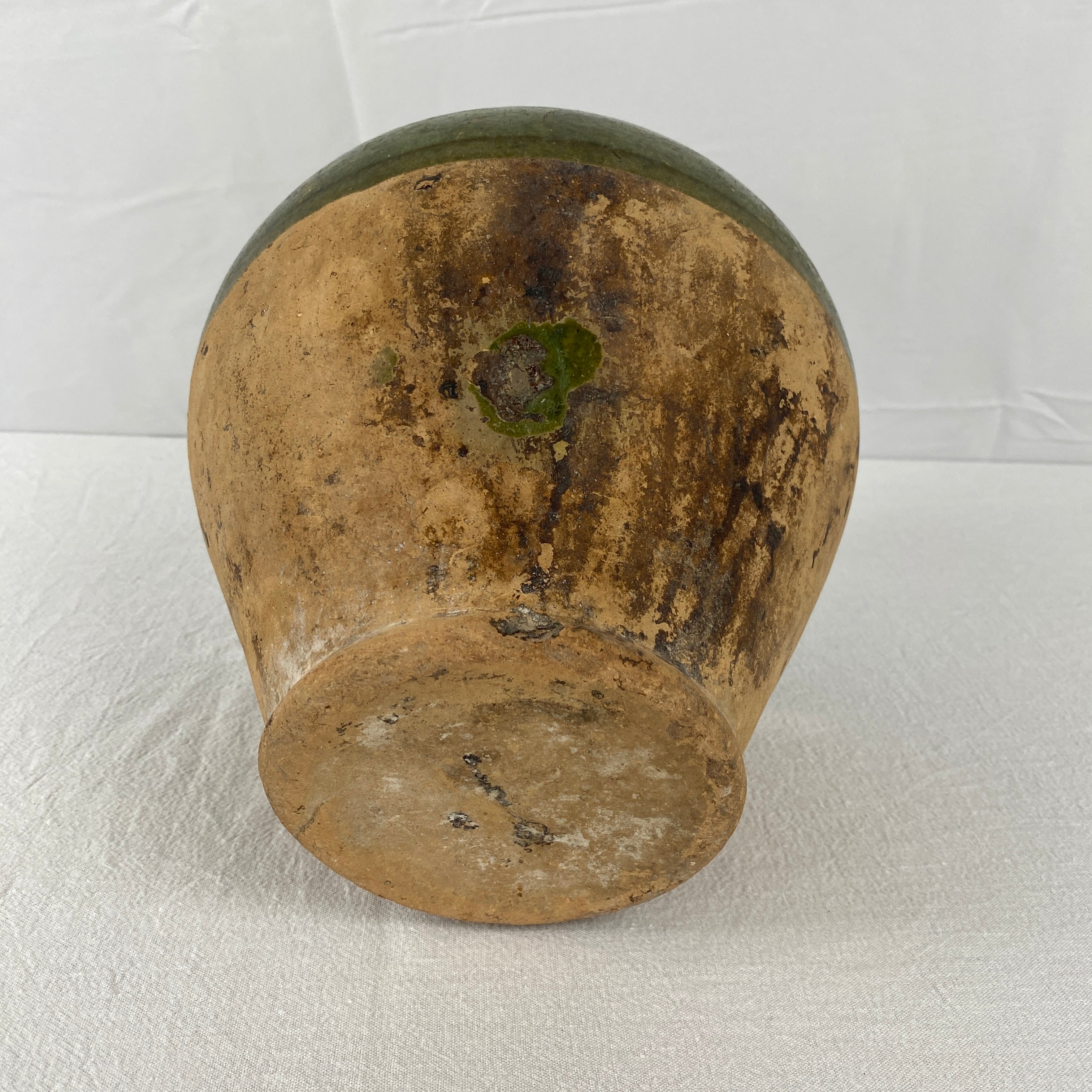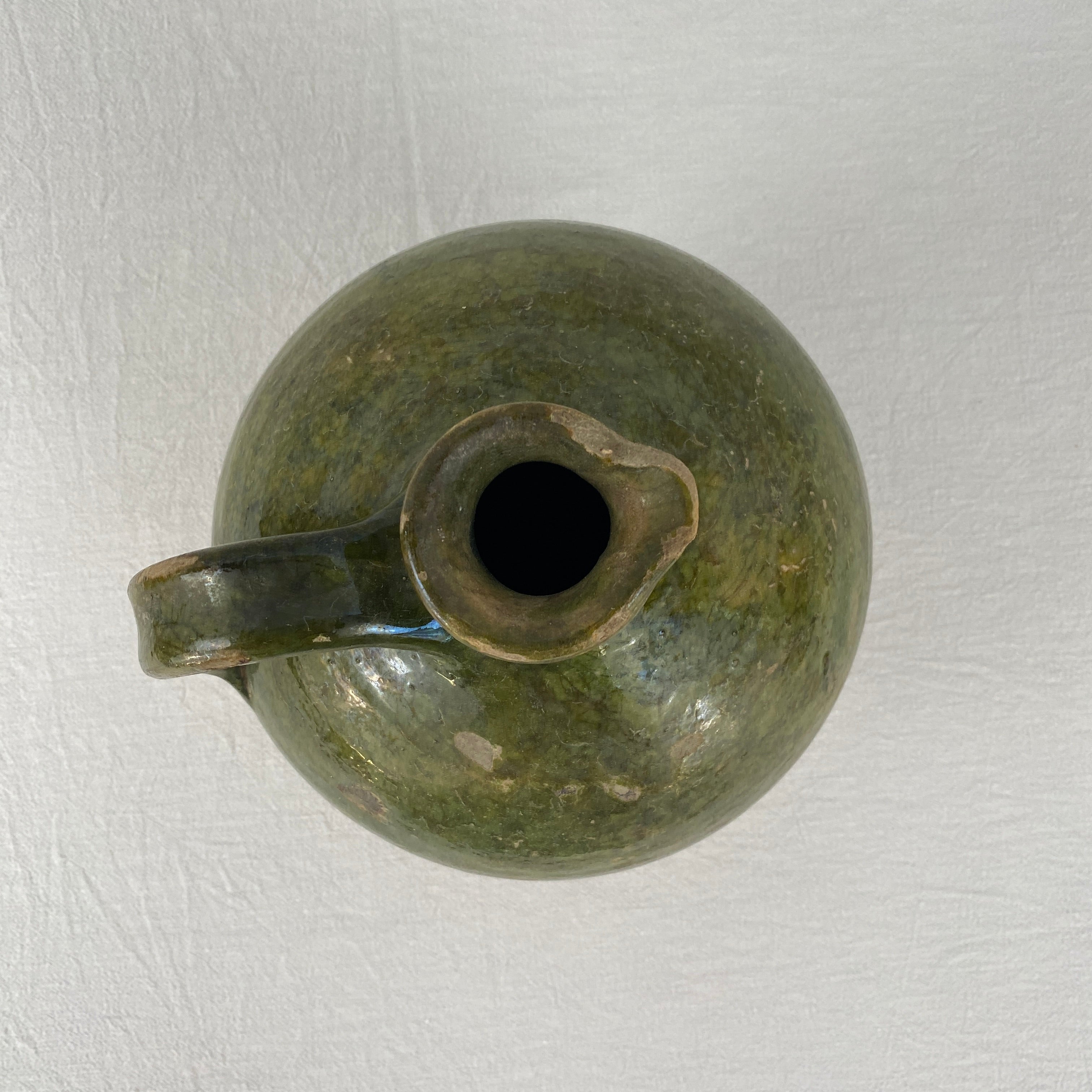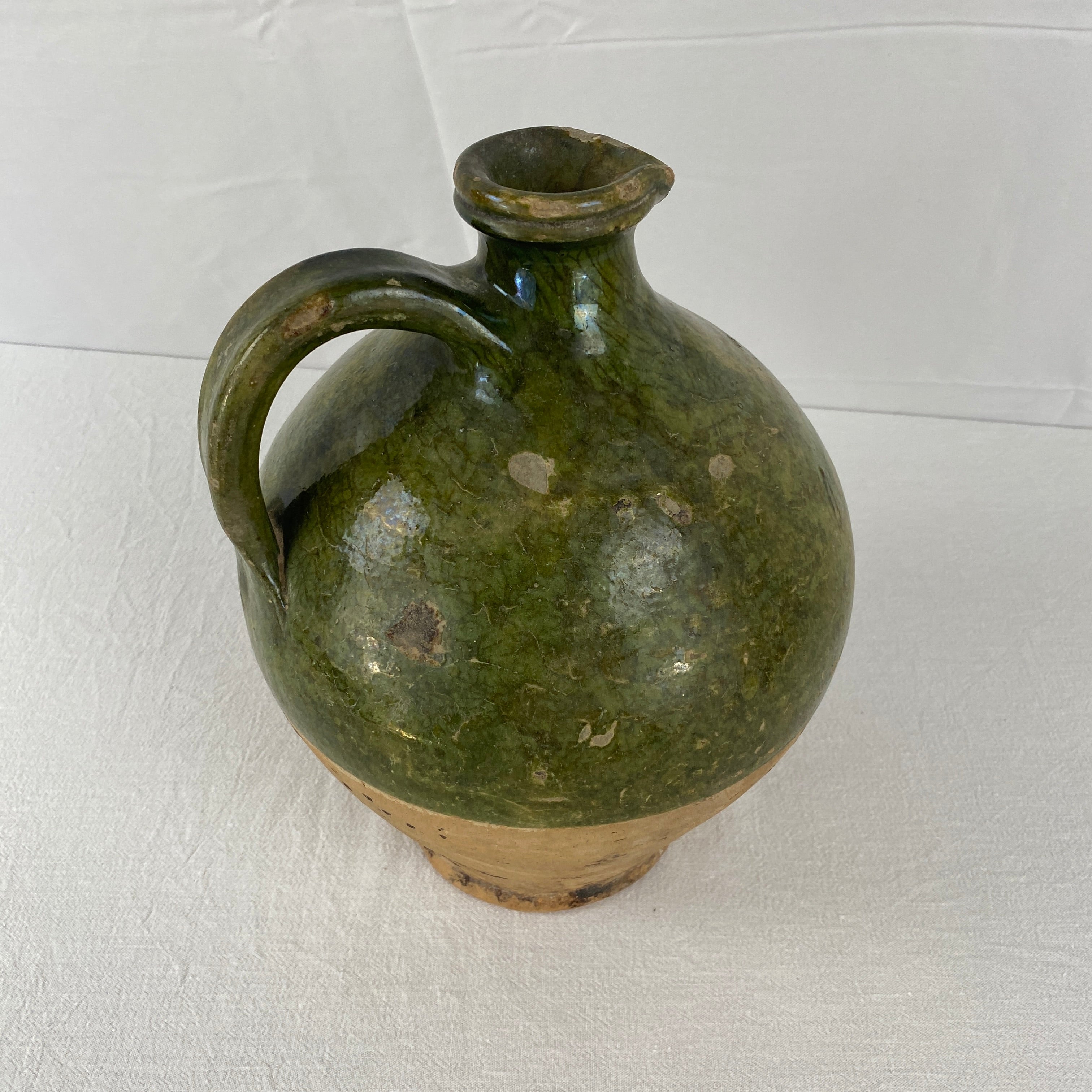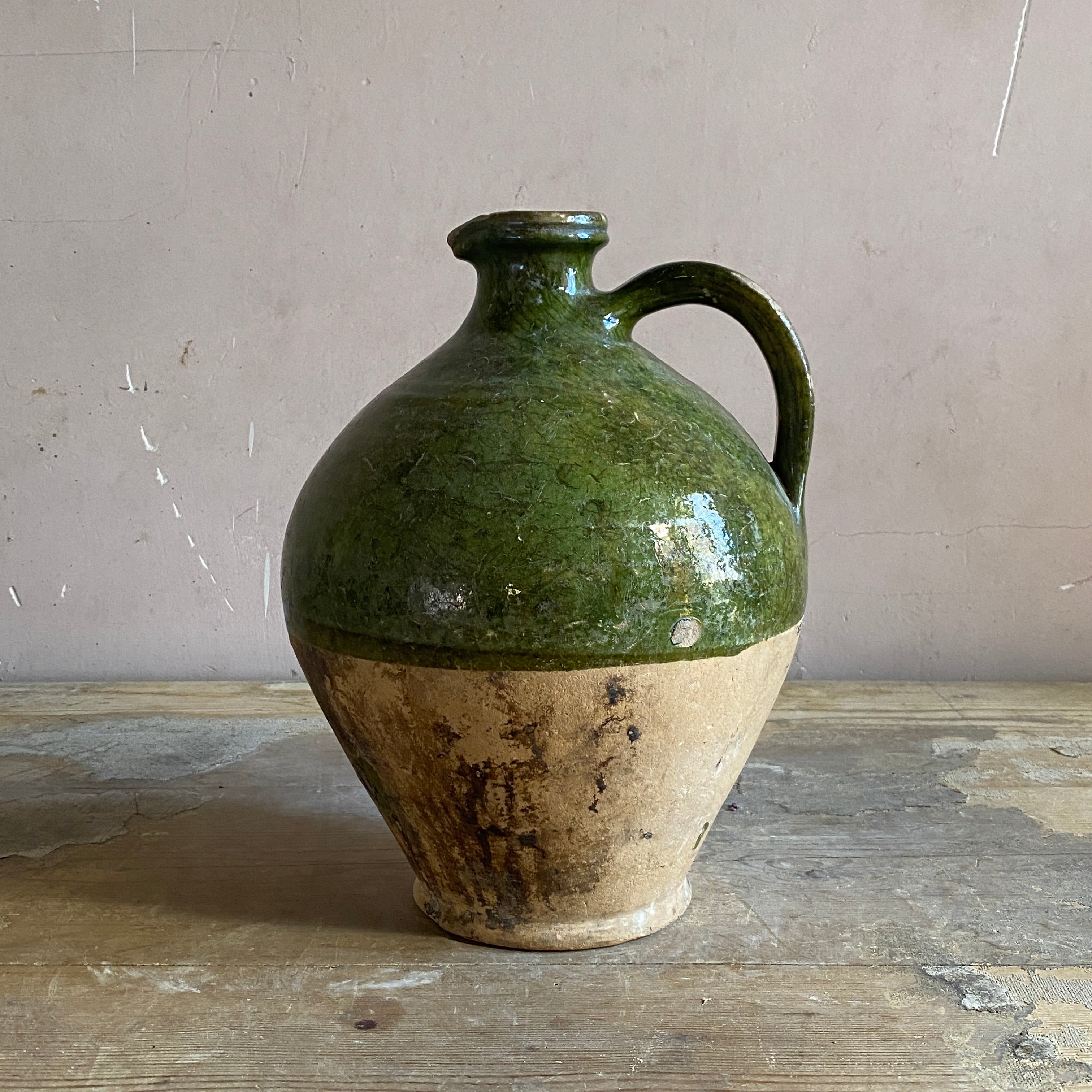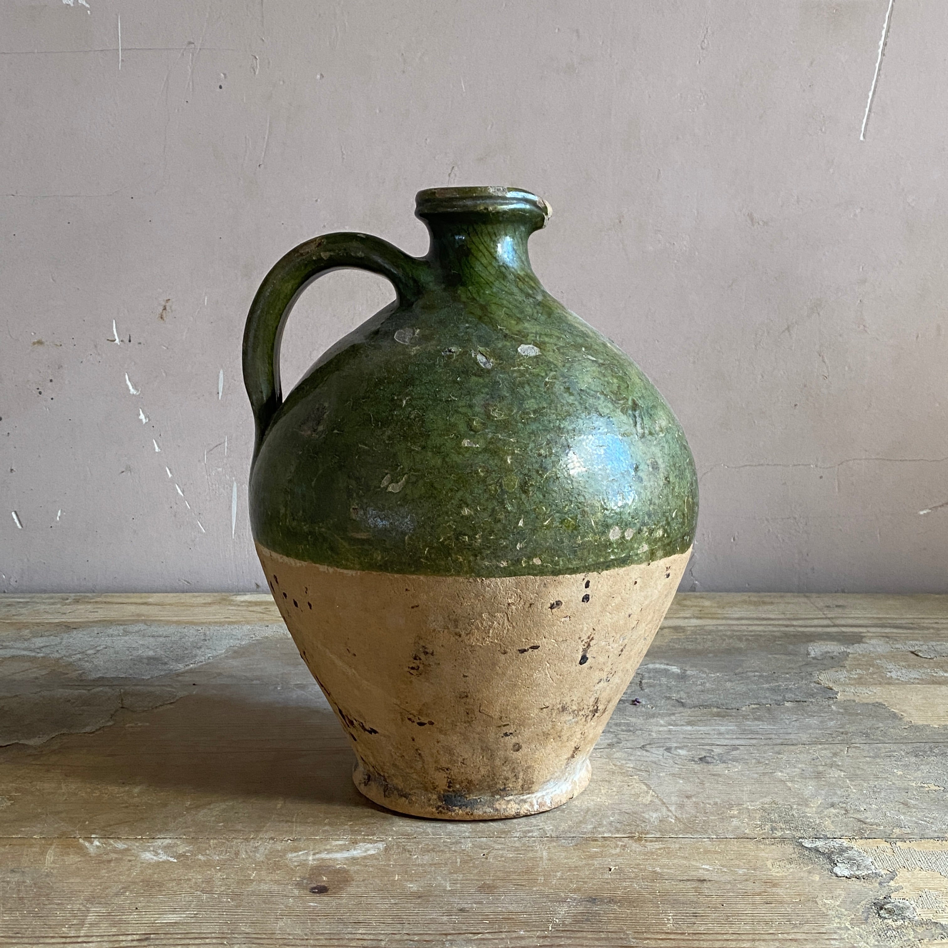 Made in the South West of France, this antique earthenware oil decanter has plenty of character. The top half has a green glaze with great patterns from wear, various marks and indentations and a beautiful patina. The bottom half is unglazed.