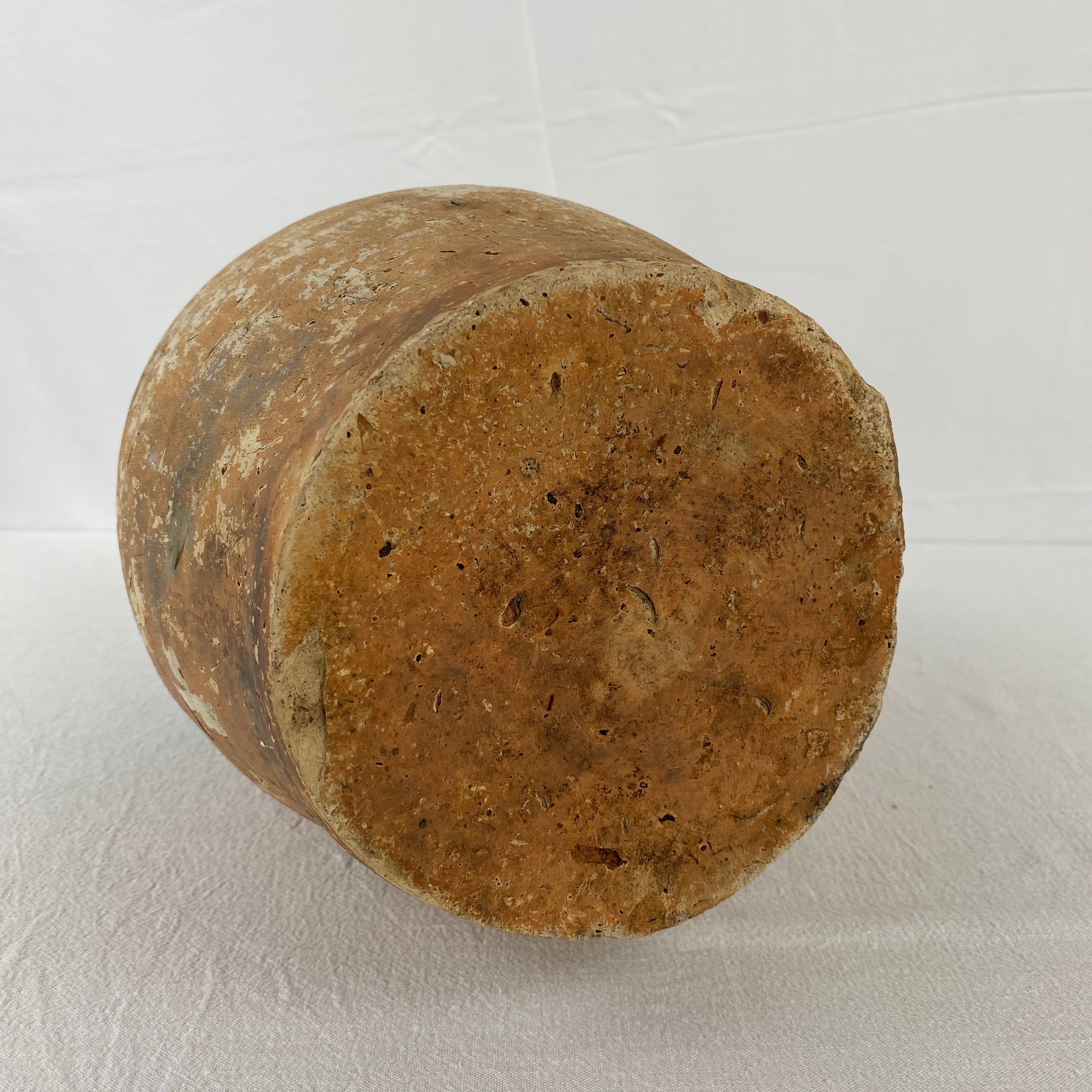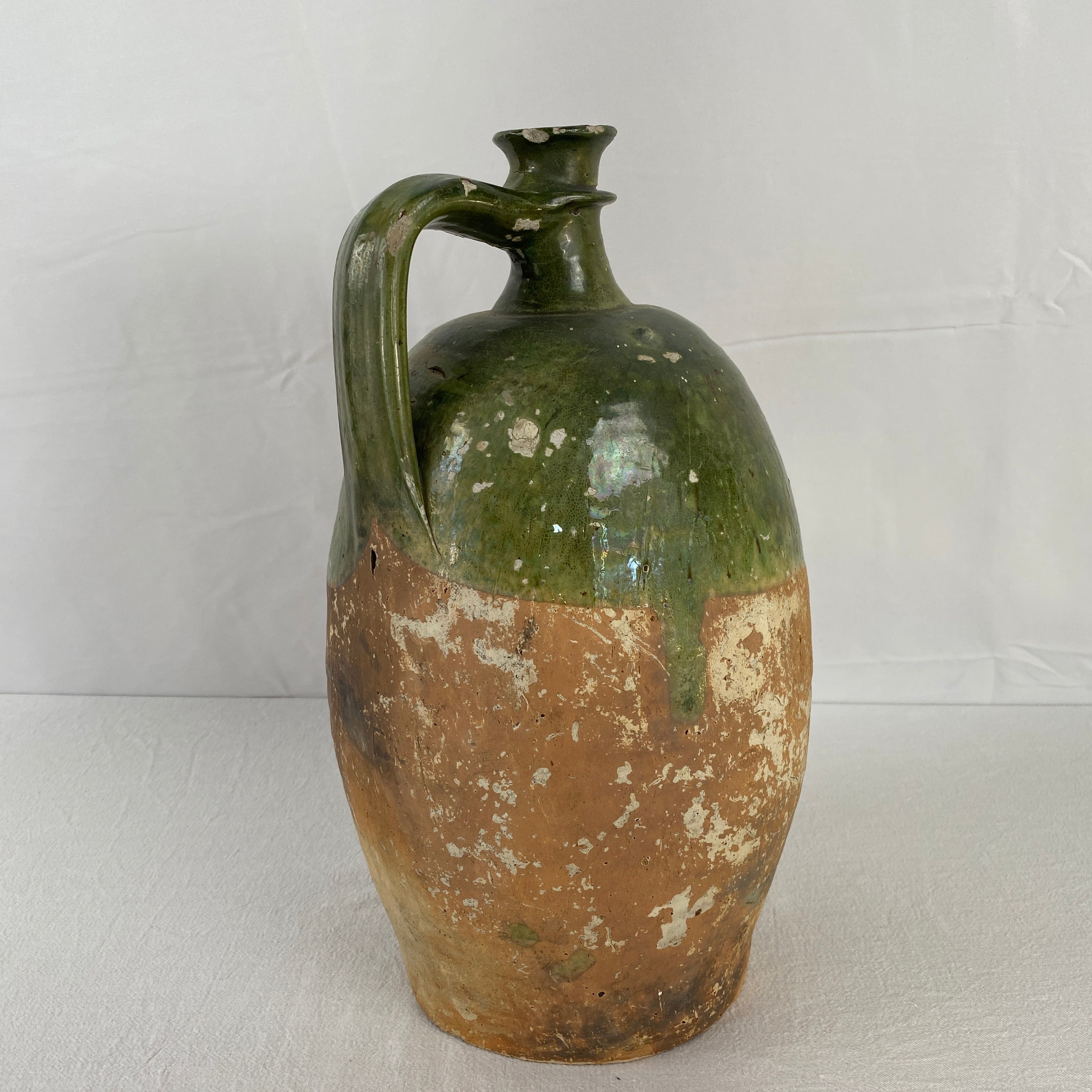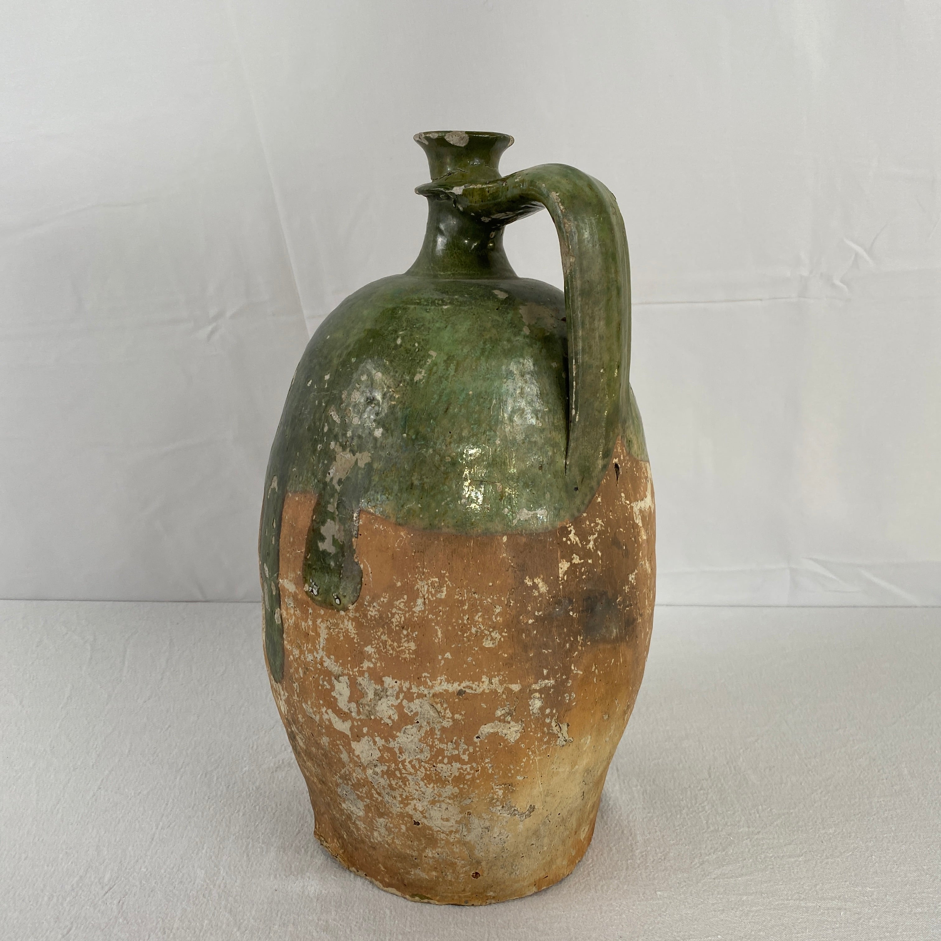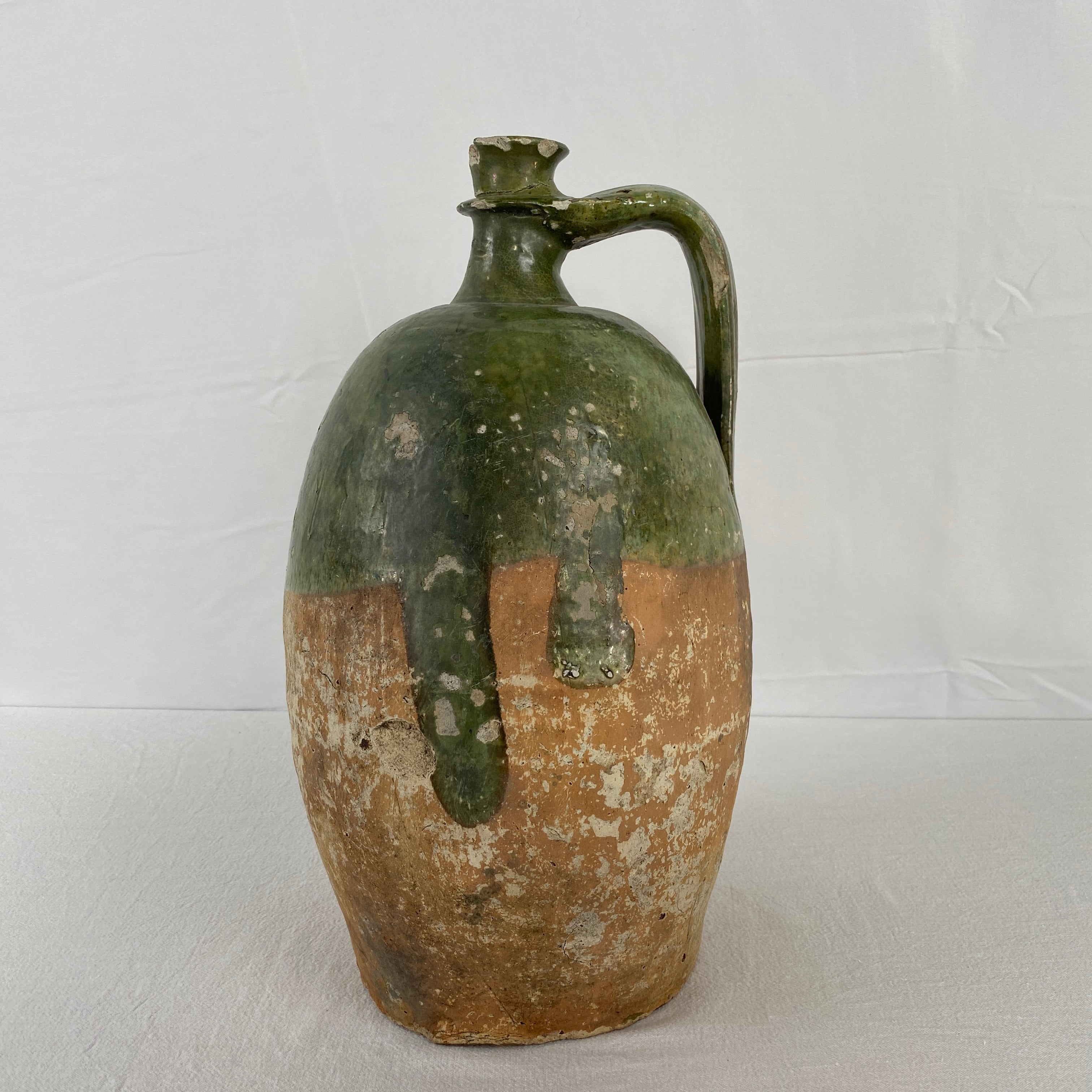The top half has a green glaze with drips down the jug. It has great patterns from wear, various marks, indentations and a beautiful patina. The bottom half is unglazed.