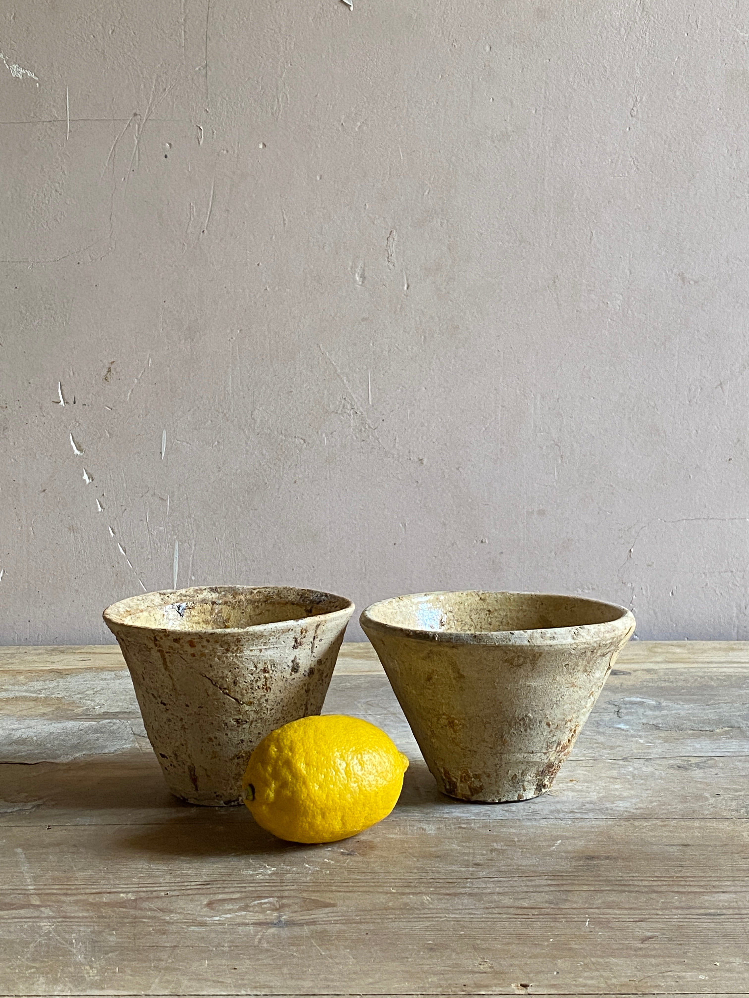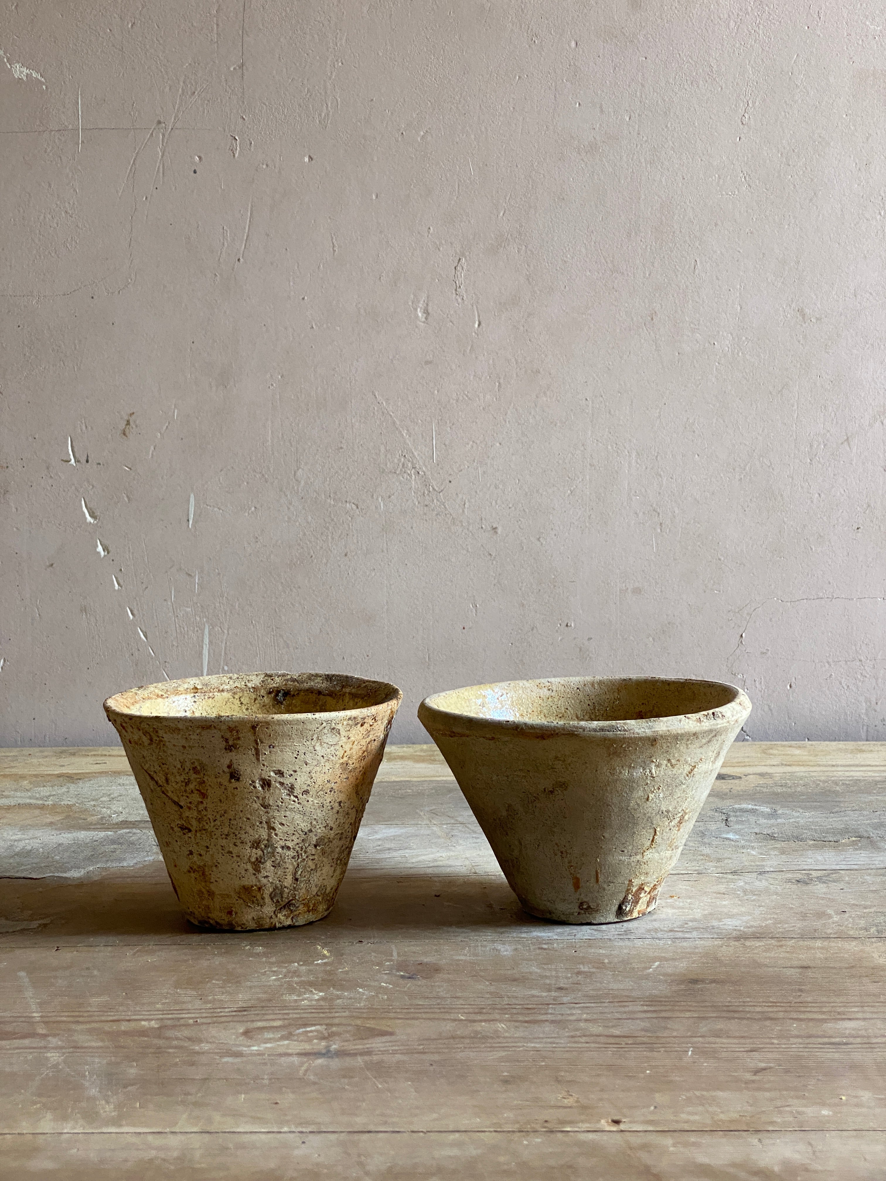 Originally used to collect the sap of pine trees in the forests of the Landes department. The farmers tied these pots to the trees, made an incision in the bark above, then allowed the sap to fill these pots.