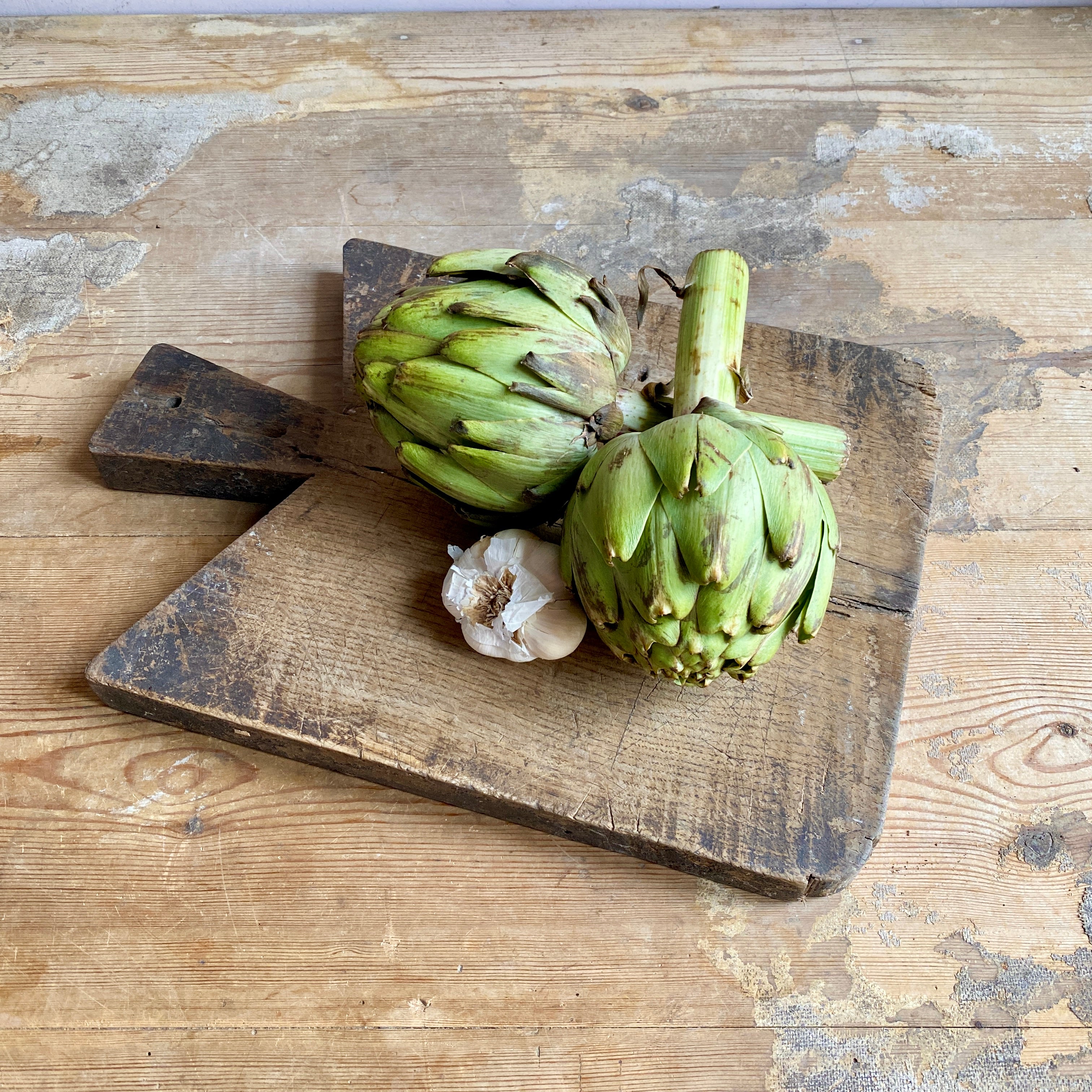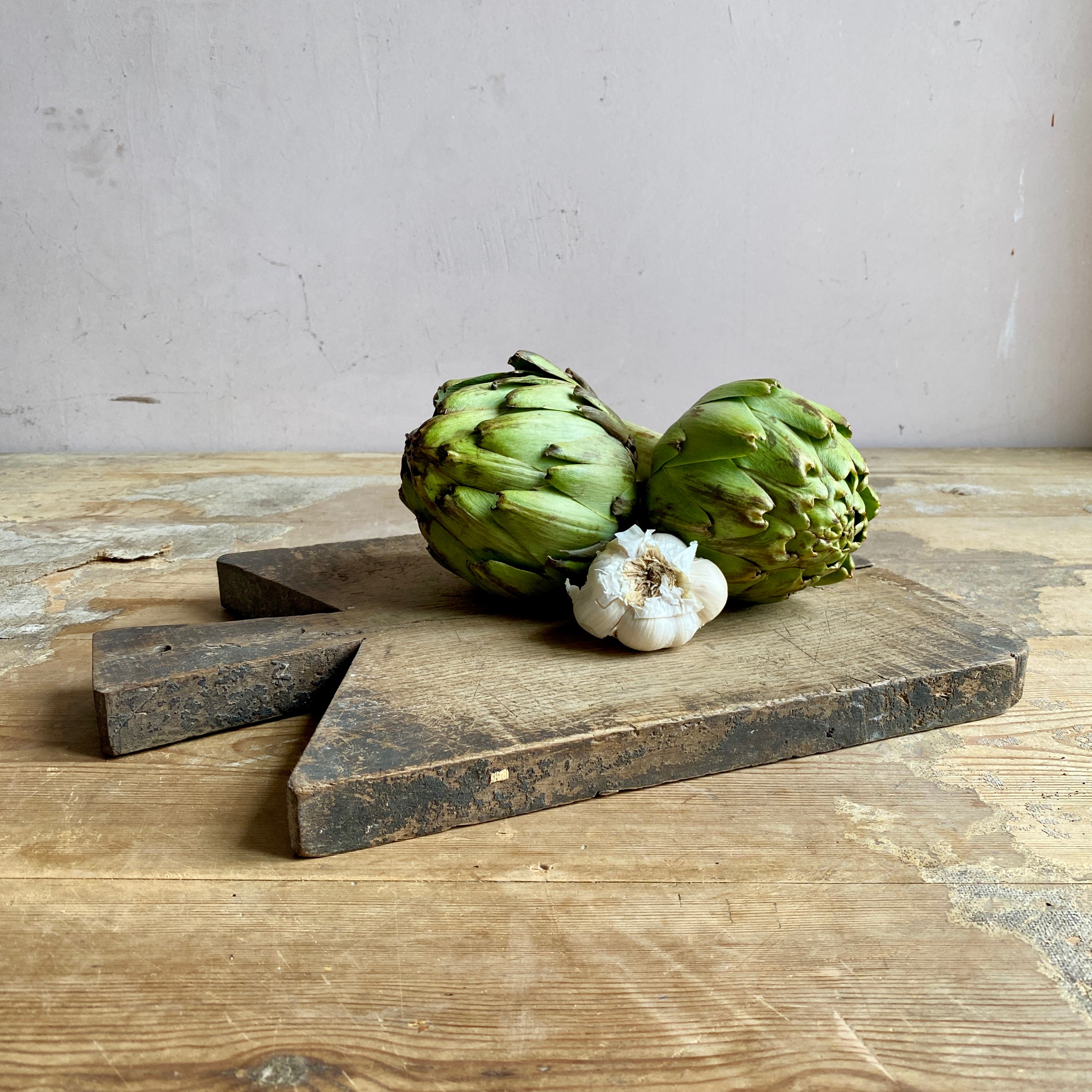 This antique French wooden chopping board is made from a single piece of thick timber. It has many scores and marks from being used in a French country kitchen for many decades.